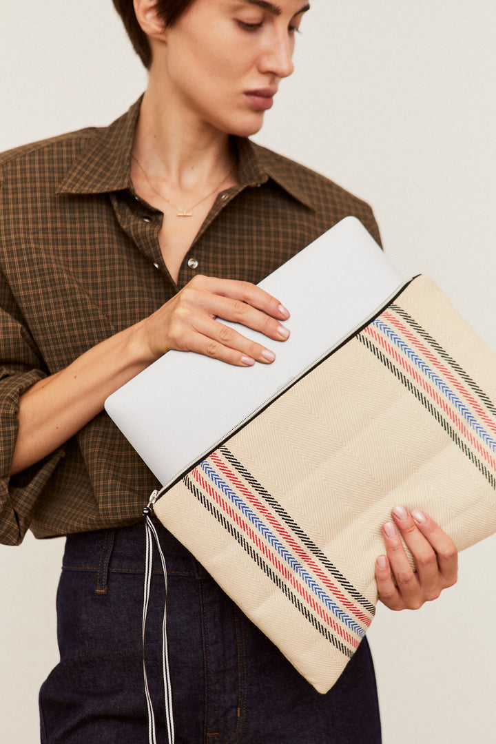 Esta funda de ordenador no solo cuida lo que llevas dentro, también cuenta lo que llevamos detrás: un tejido tradicional como la sarga de Burgos, en su versión más sobria y elegante, en crudo natural. Tiene forro protector, cierre cómodo y ese aire de pieza hecha con cariño que la convierte en un básico para el día a día. Ideal para llevar tu portátil con estilo, artesanía y un trocito de nuestras raíces.