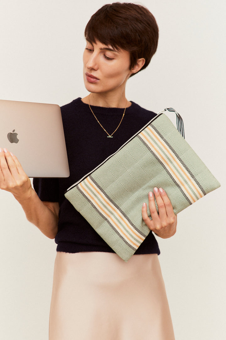 La funda de ordenador en sarga de Burgos verde es perfecta para quienes buscan proteger su portátil con carácter. El tejido, inspirado en los sacos tradicionales de trabajo, aporta ese aire nostálgico y castizo que nos encanta, pero con un diseño práctico y actual.