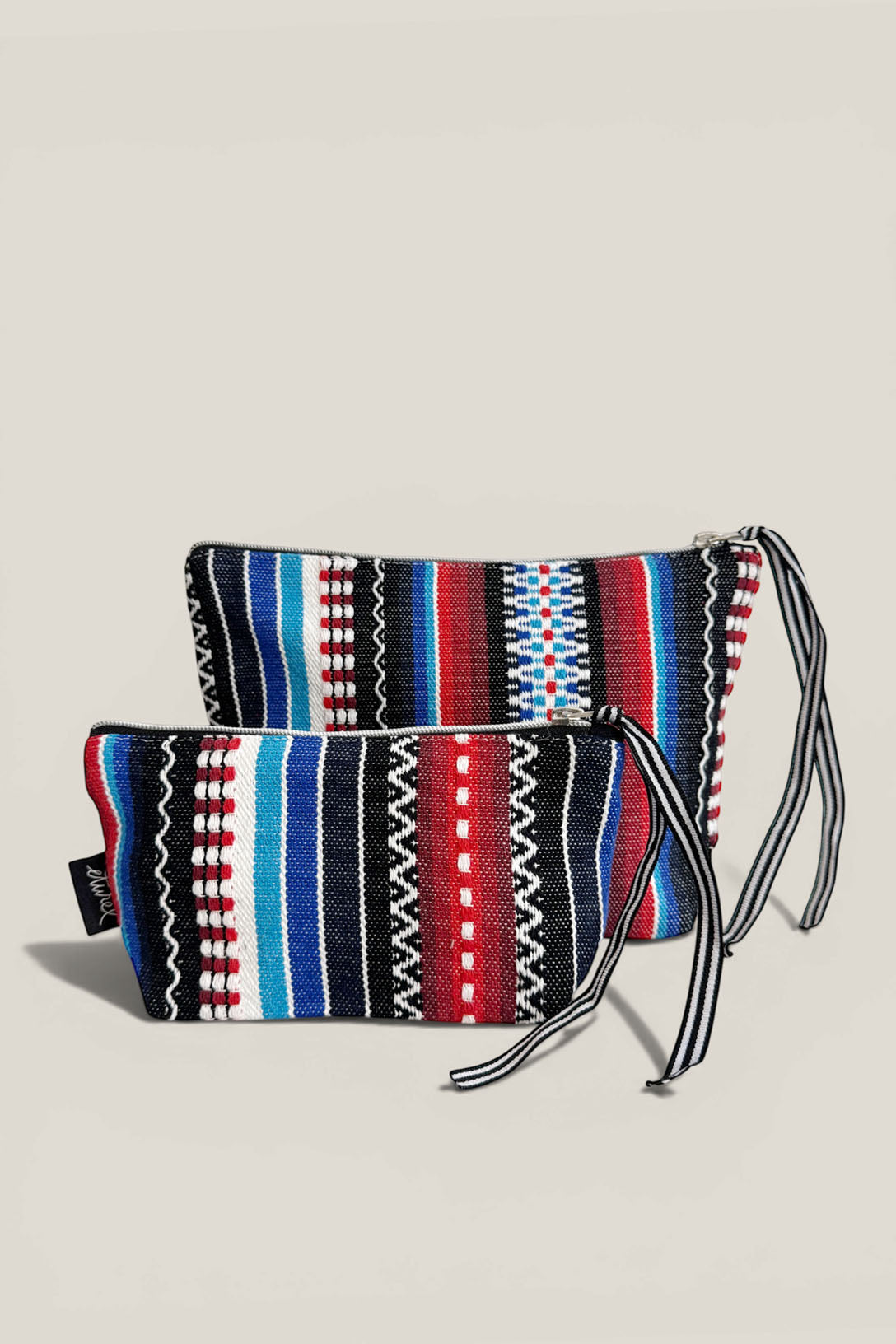 Nuestro neceser y estuche en tejido manchego azul están confeccionados con el tradicional tejido inspirado en las cortinas de los pueblos, esas que dejan pasar la luz de la siesta y evocan recuerdos de casa.
