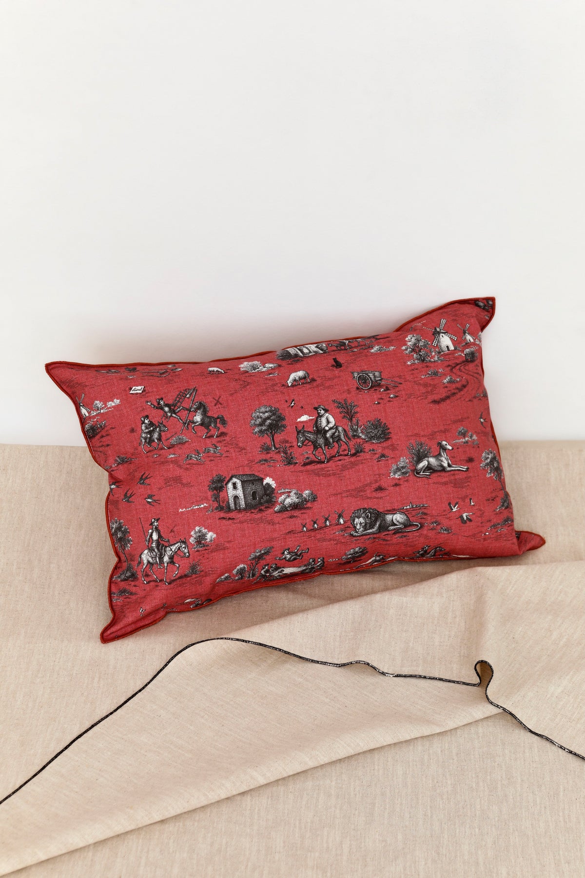 Este cojín de la colección Quijote presenta un estampado exclusivo sobre fondo rojo, inspirado en el universo de Don Quijote de la Mancha, con escenas y elementos que evocan el paisaje manchego.