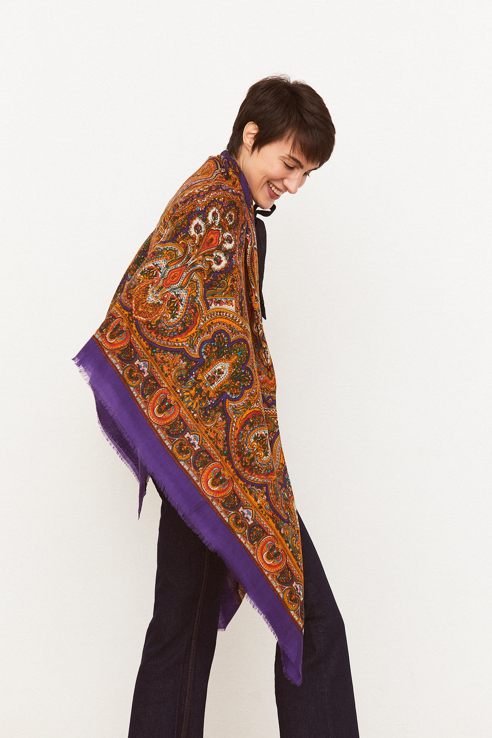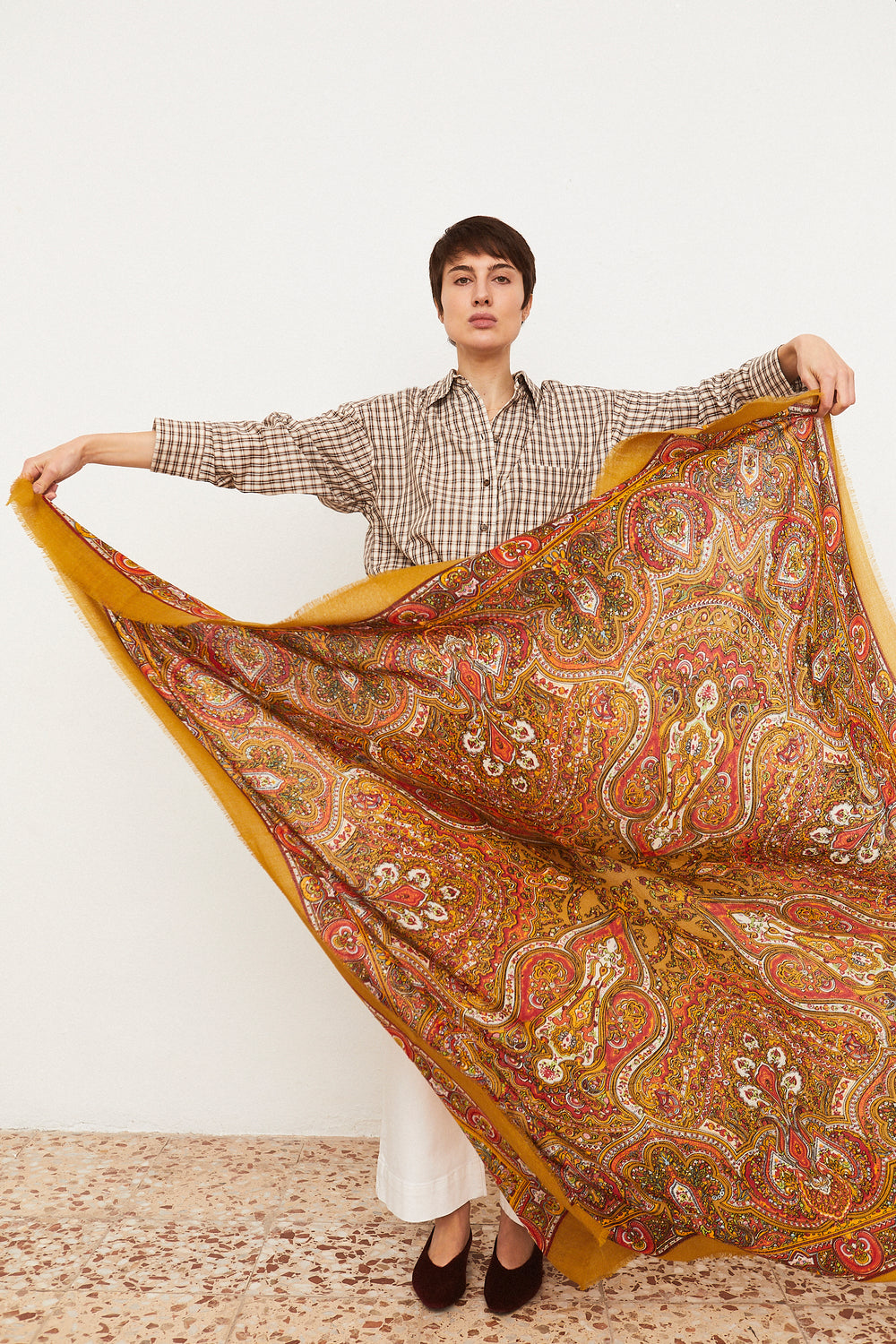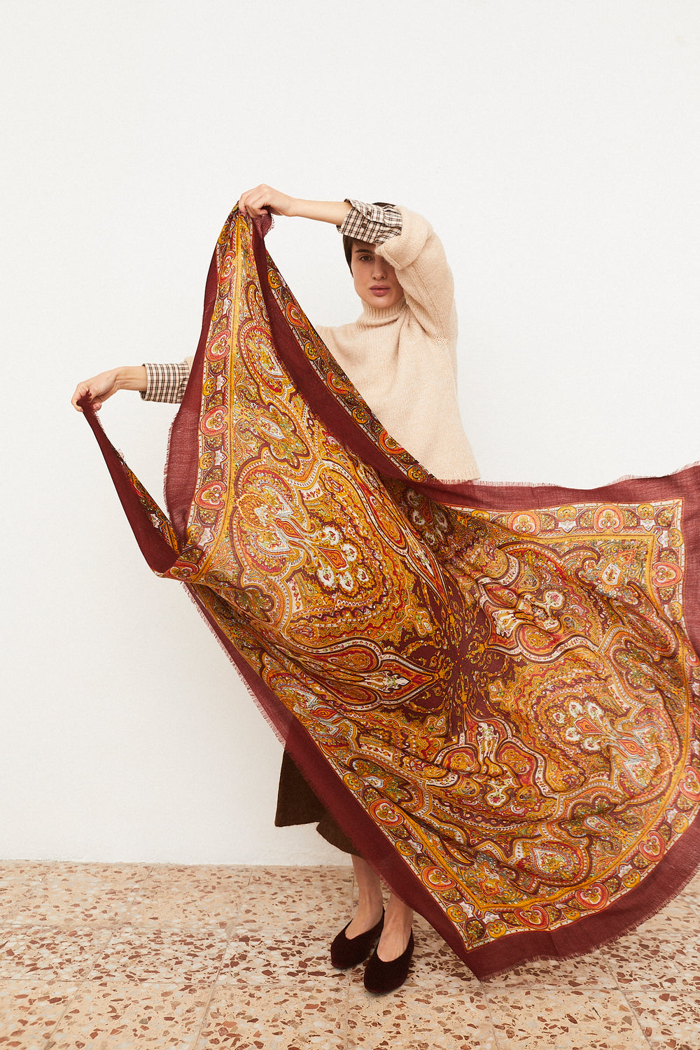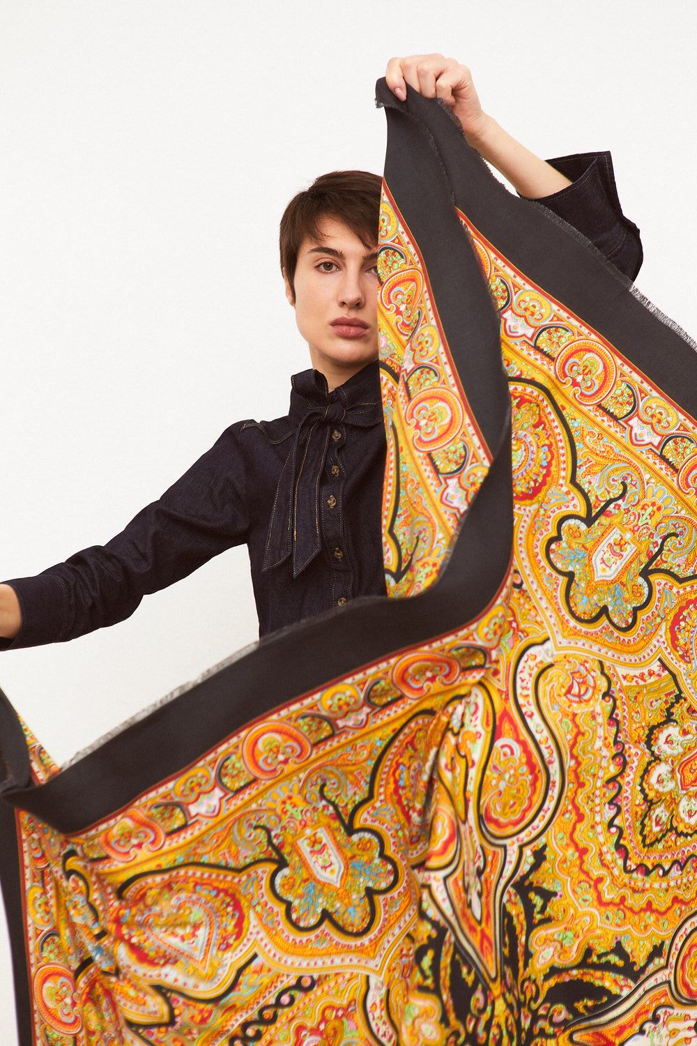 Confeccionado en viscosa suave, este pañuelo presenta motivos tradicionales estampados que replican el dibujo original de los pañuelos de los siglos XIX y XX, preservando su estética popular y su carácter artesanal.