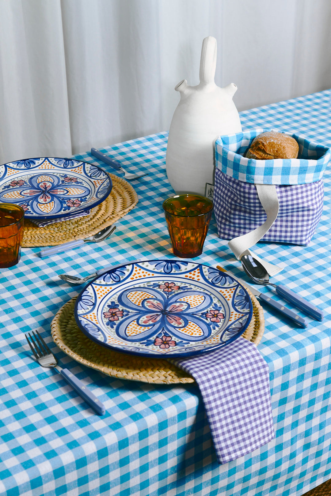 Mantel 140cm x 240cm cuadros vichy azul celeste detalle