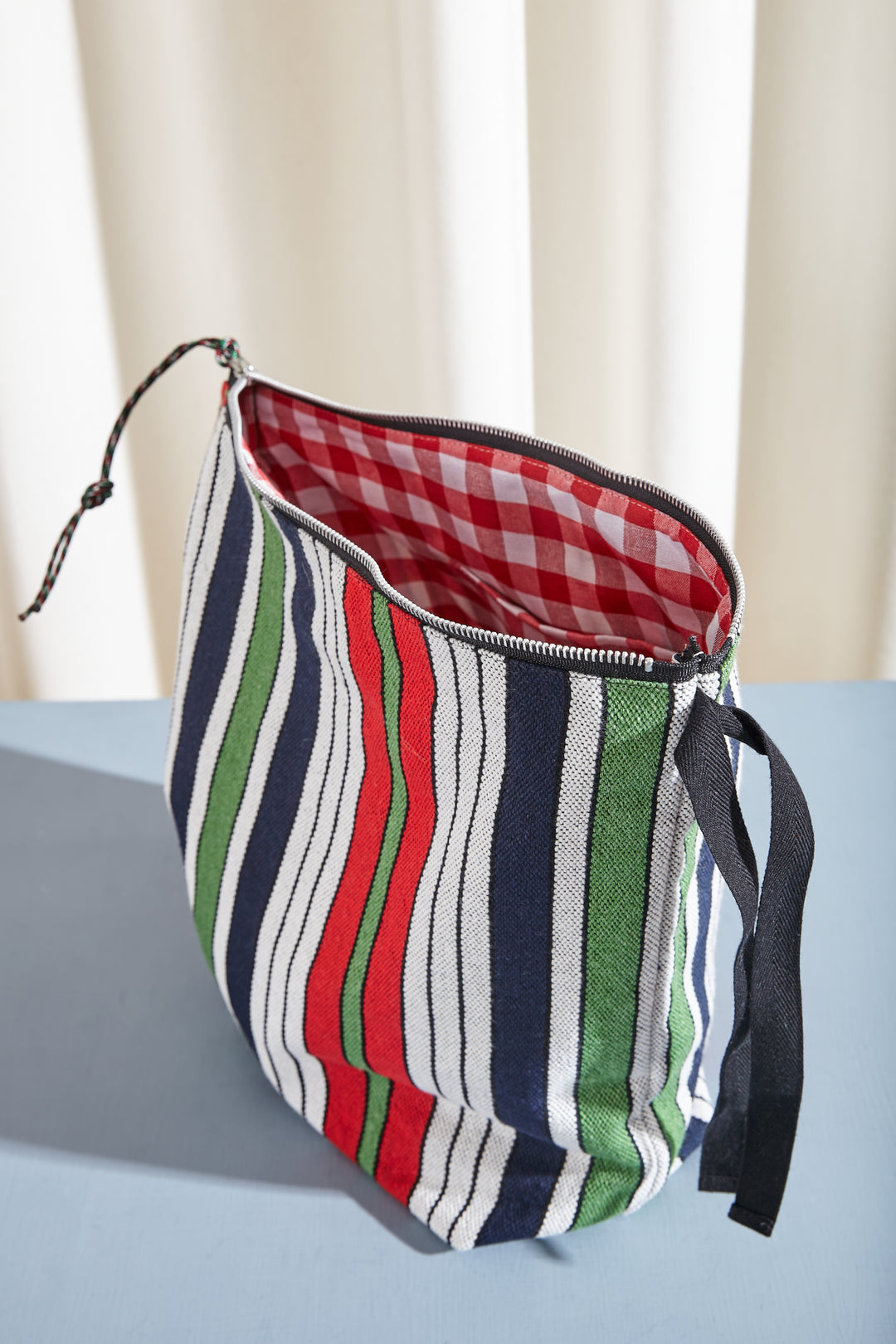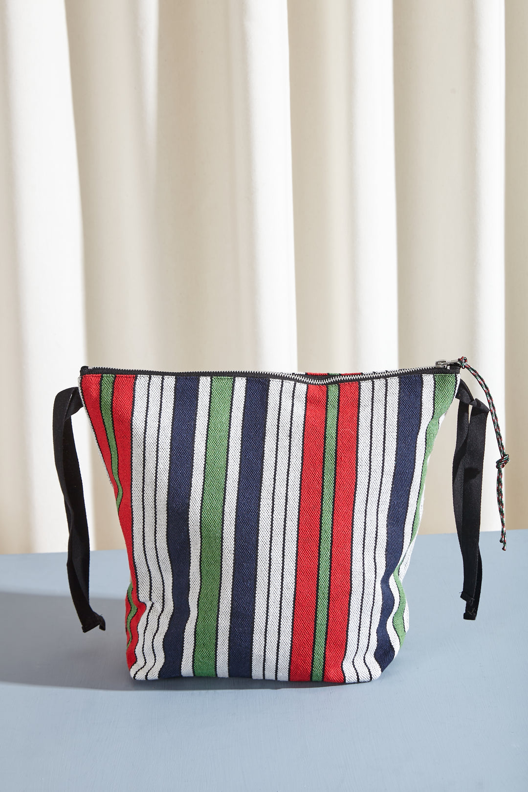 - Neceser con forma de triángulo, con dos cintas de algodón negras en la parte superior para anudar al capazo.