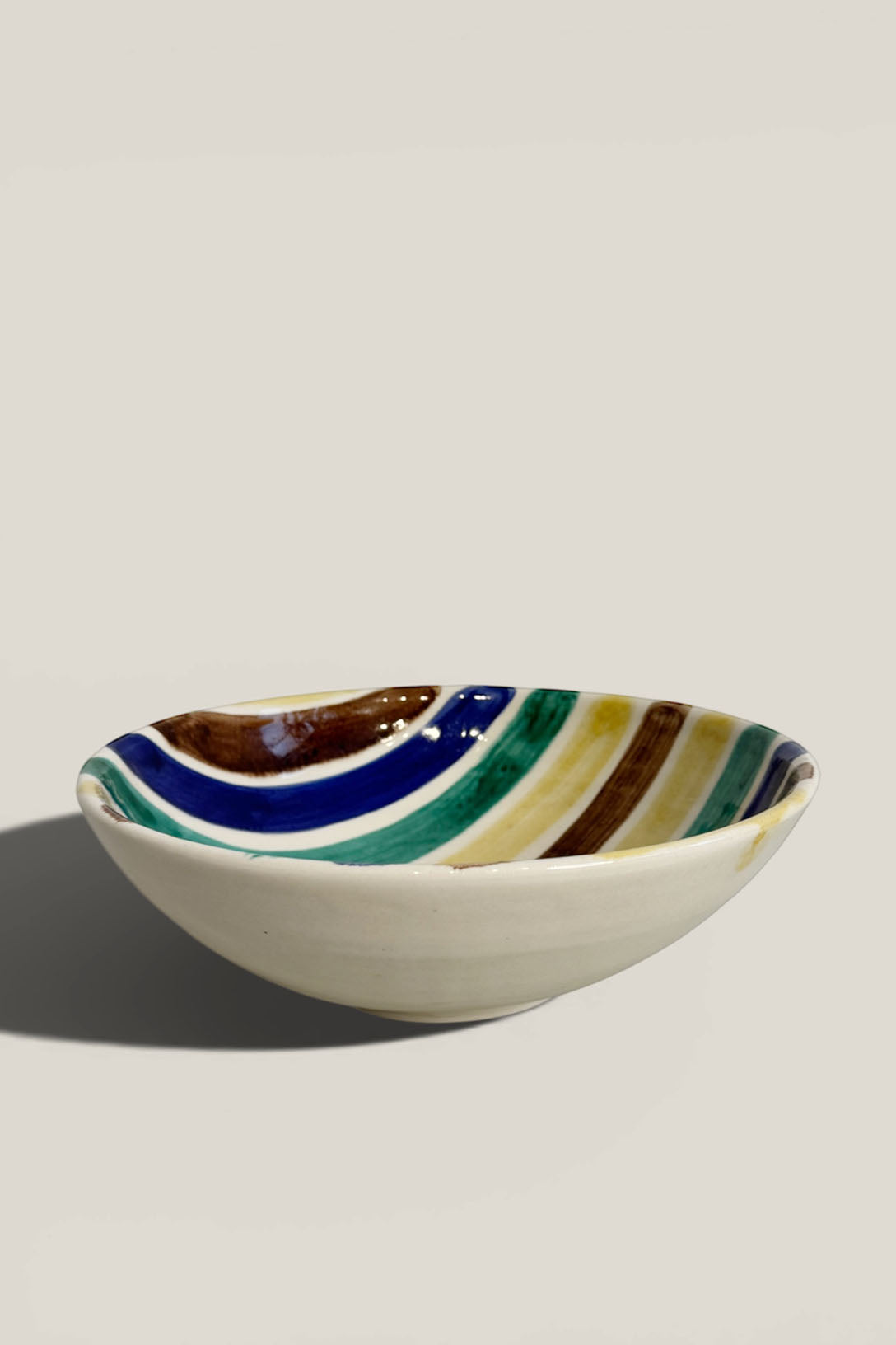 La ensaladera alta de Níjar en diseño de rayas es una pieza icónica de la cerámica almeriense. Elaborada y pintada a mano, combina los colores tradicionales de Níjar —verde, azul, amarillo y marrón— en un juego de franjas curvas que envuelven la pieza con movimiento y carácter.