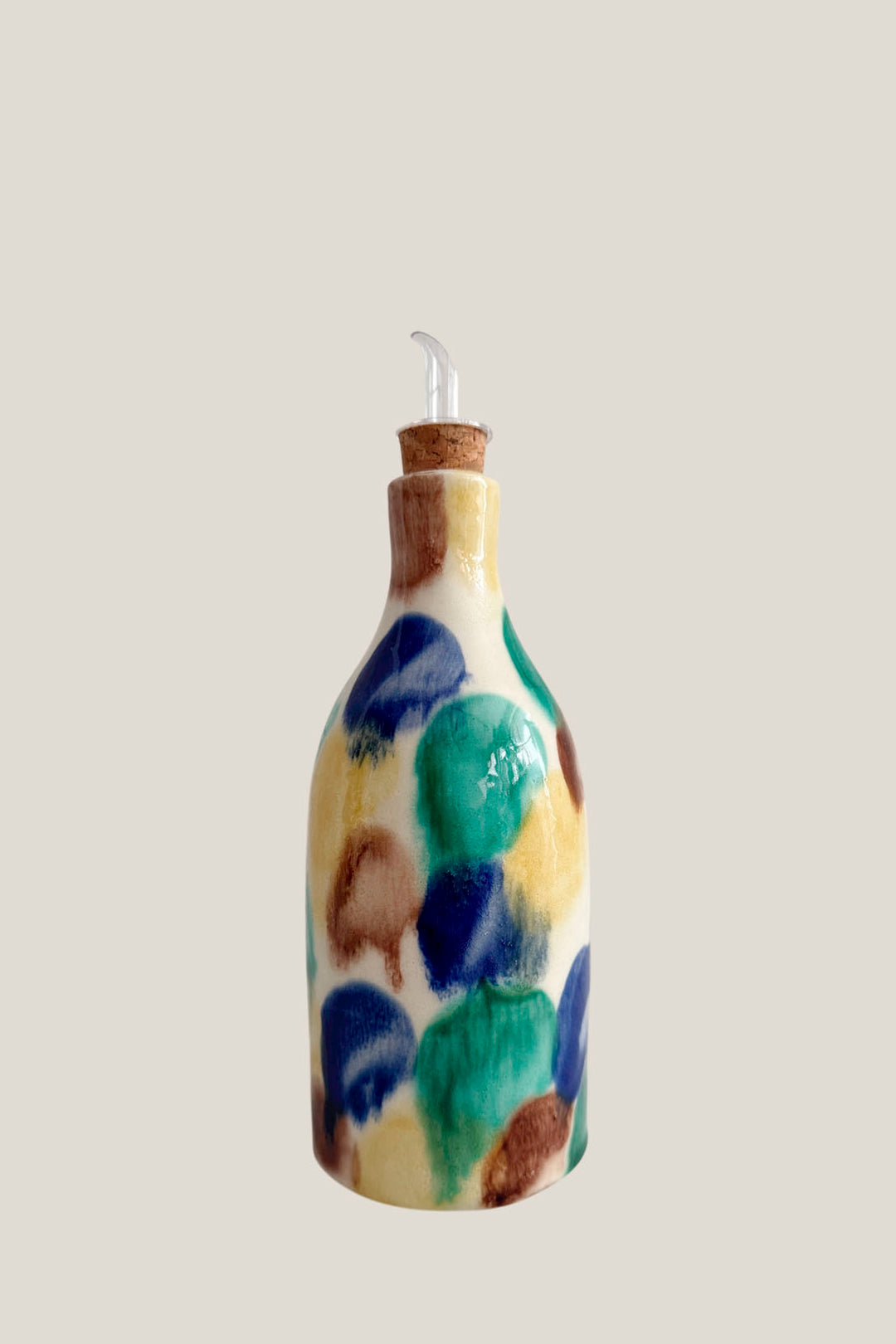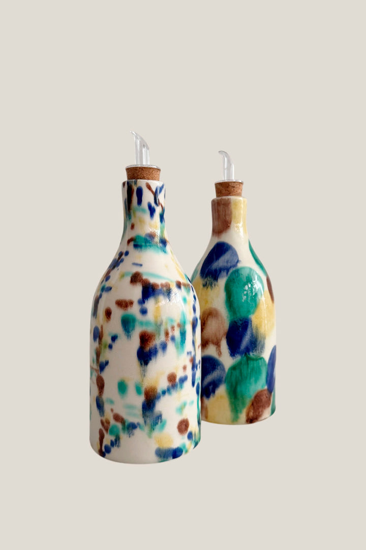 Este par de aceiteras artesanales hechas en Níjar lo tienen todo: una forma cónica cómoda y elegante, un tapón de corcho para servir con precisión, y un diseño que roba miradas.