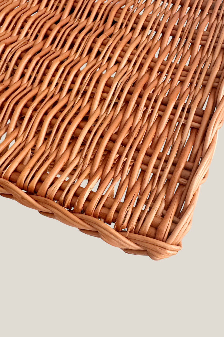 Hecha a mano en mimbre natural, esta bandeja pedestal eleva cualquier presentación con un encanto sencillo y auténtico. Su base firme y su forma cuadrada la convierten en el soporte perfecto para dulces, frutas, quesos o pequeños adornos, aportando un aire cálido y artesanal a la mesa.