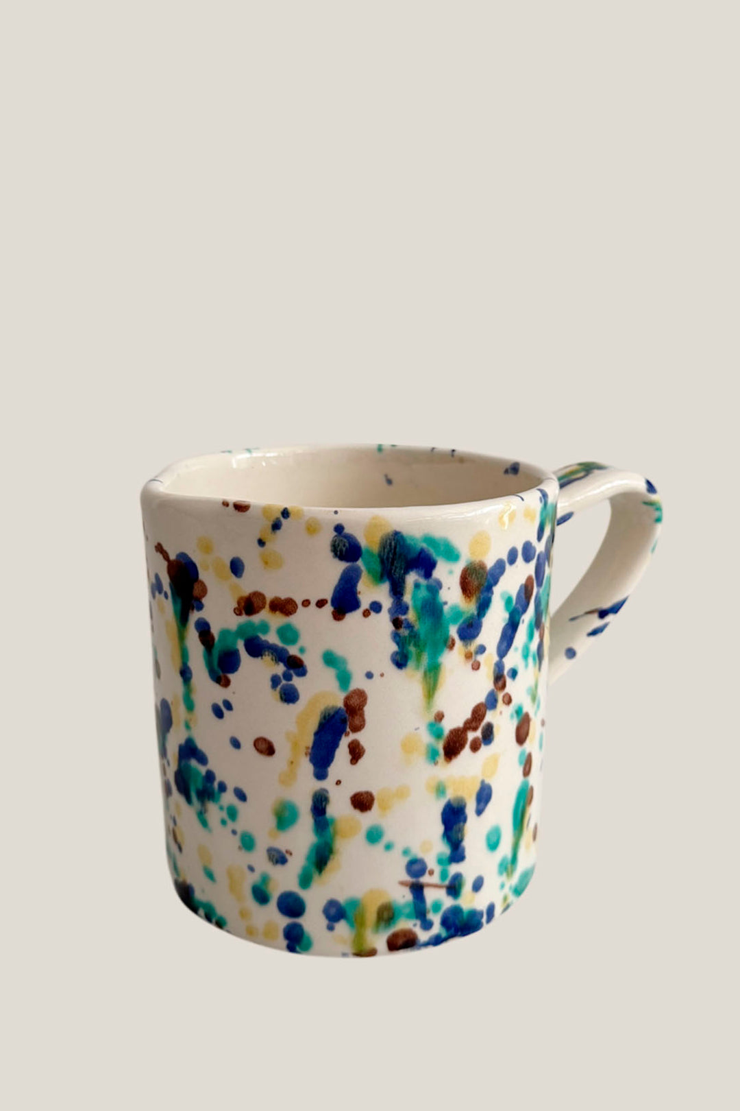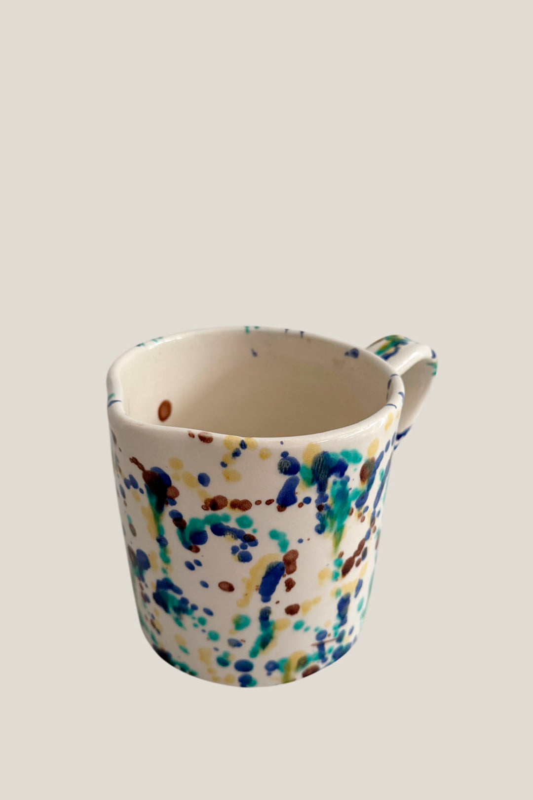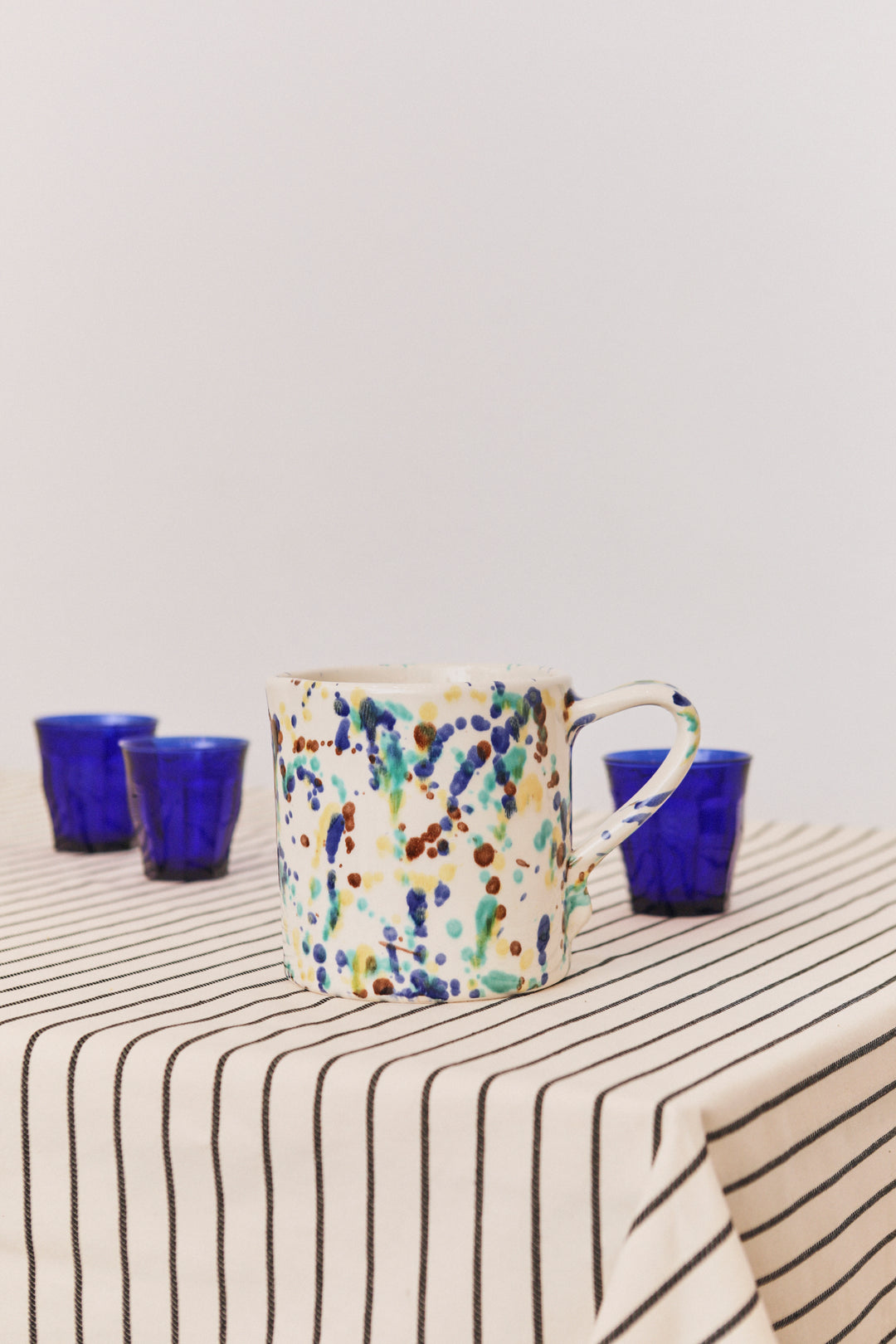 Pintada a mano en Níjar, su decorado de pequeños puntos en tonos tierra, azul y verde se dispersa sobre la superficie con una naturalidad vibrante, como si alguien hubiese celebrado algo bonito y dejara rastro de su alegría.
