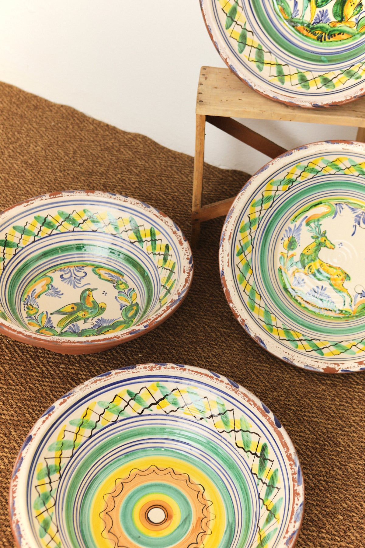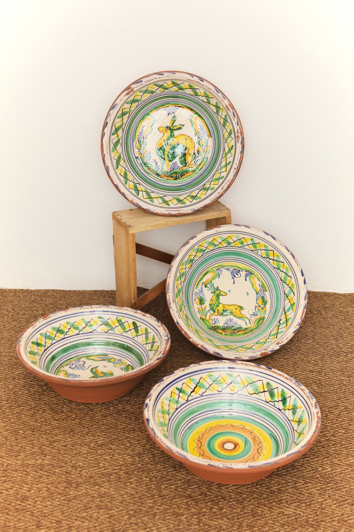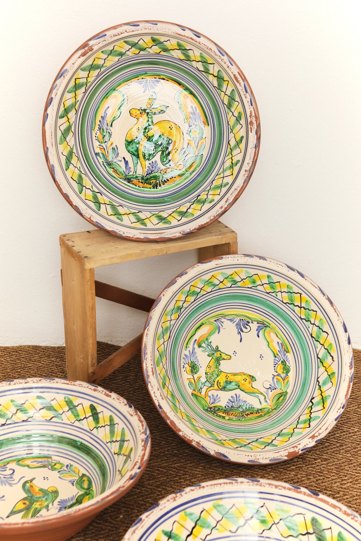 Nuestros lebrillos trianeros son un ejemplo: herederos de la tradición alfarera de Triana, pintados a mano con los tonos clásicos (verde cobre, azul cobalto y manganeso) y decorados con escenas de animales que dan vida y carácter a cada pieza.