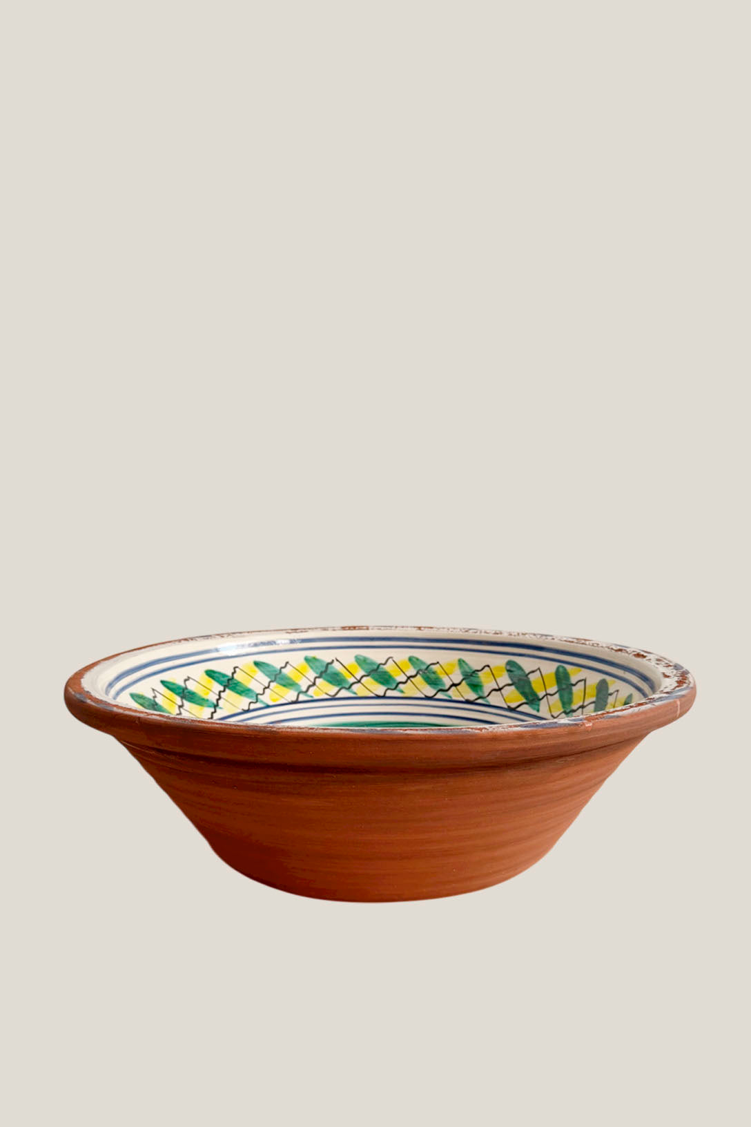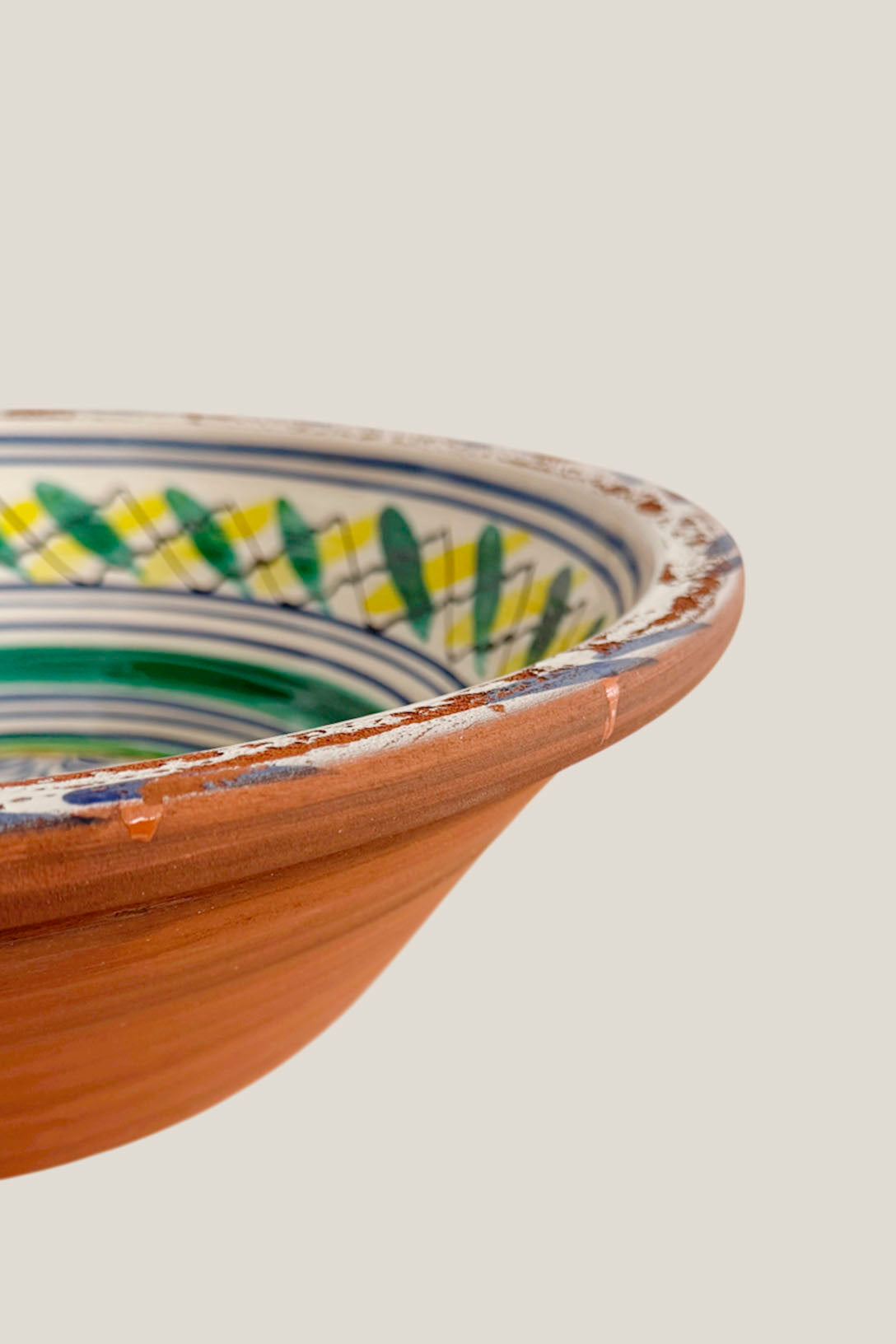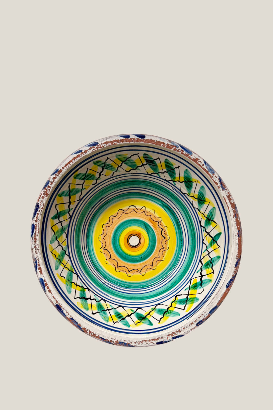 Nuestros lebrillos trianeros son un ejemplo: herederos de la tradición alfarera de Triana, pintados a mano con los tonos clásicos (verde cobre, azul cobalto y manganeso) y decorados con escenas de animales que dan vida y carácter a cada pieza.