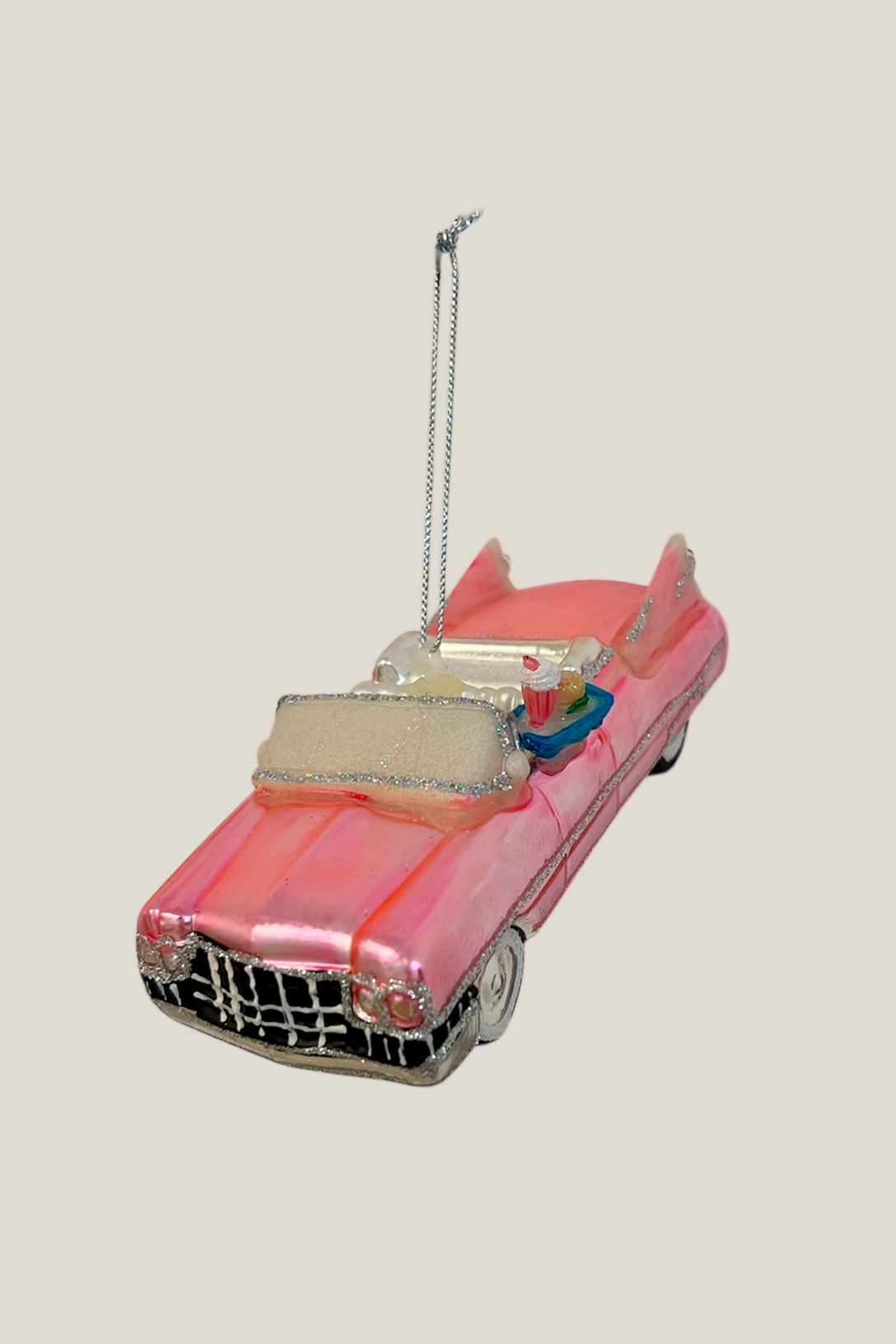 Este adorno es puro espíritu años 50 con extra de Navidad, ideal para fans de Grease, de los diners de neón o de cualquier persona que alguna vez haya querido entrar a la cena de Nochebuena haciendo una entrada triunfal con su coche rosa chicle.