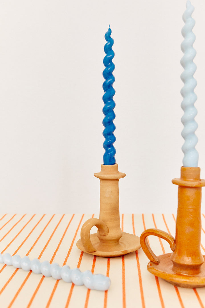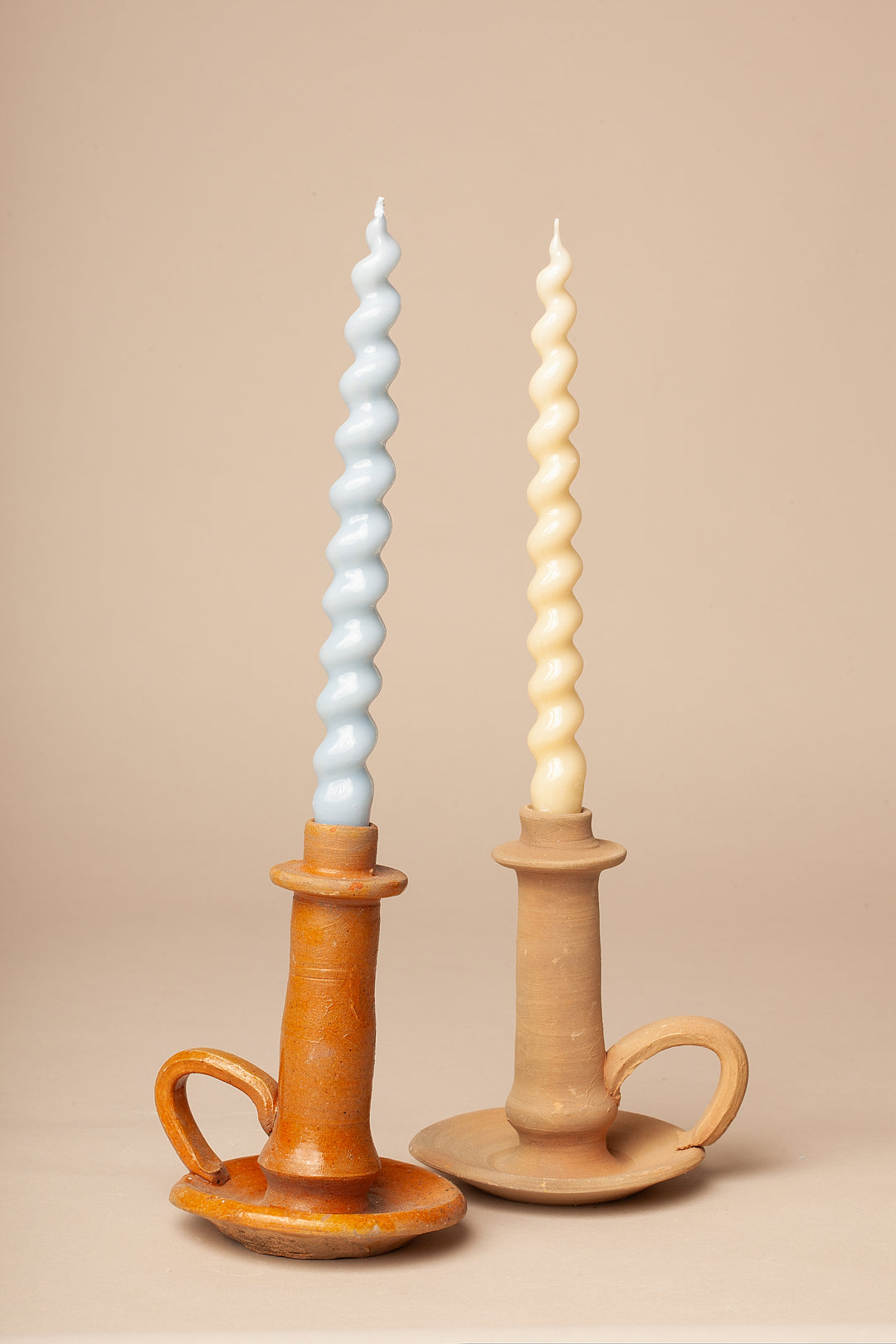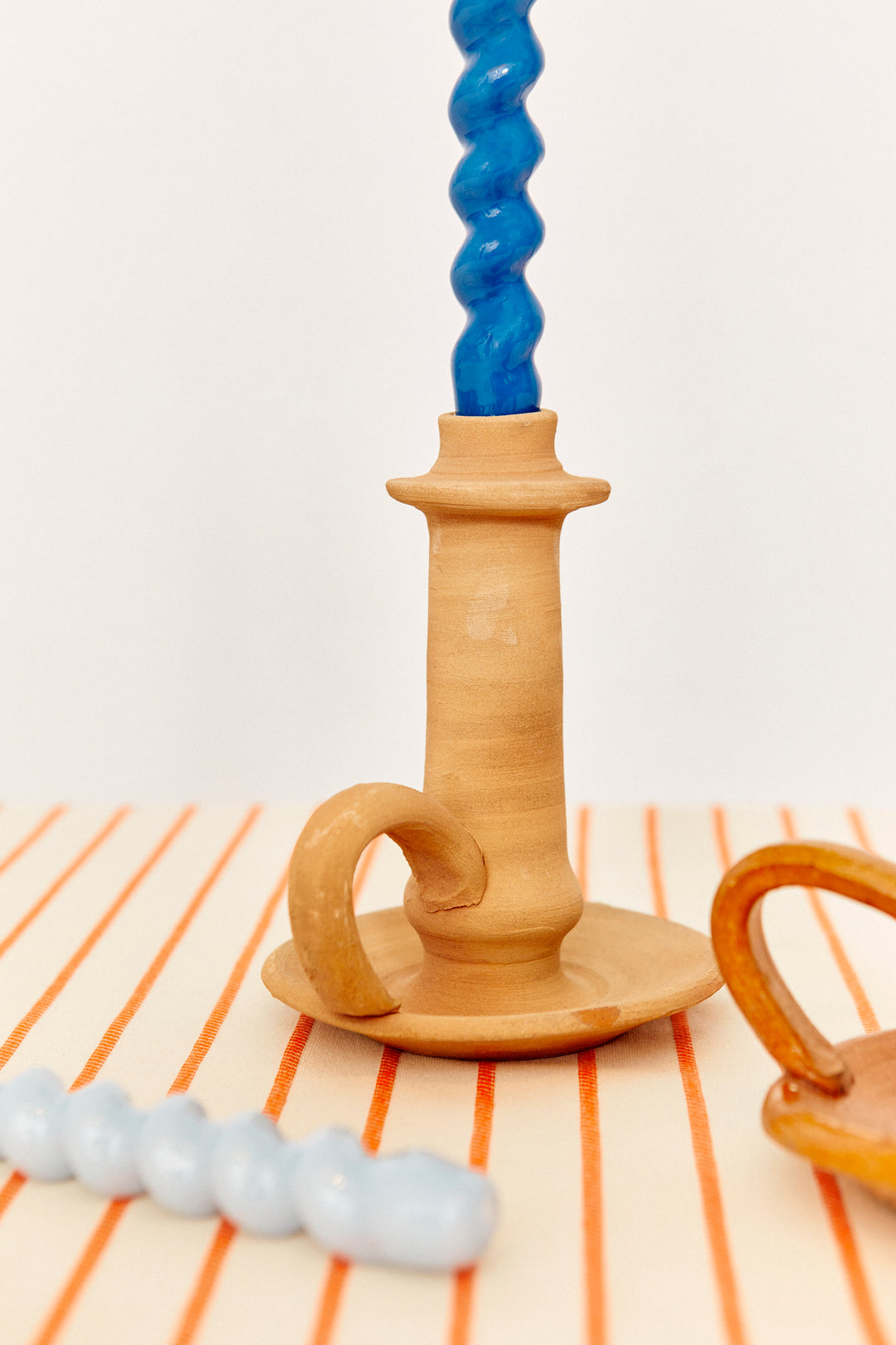 Palmatoria con parte inferior en plato, hecho a mano en barro. Las imperfecciones naturales resaltan su autenticidad. Ideal para aparadores modernos, añade un toque contemporáneo y cálido a tu hogar.