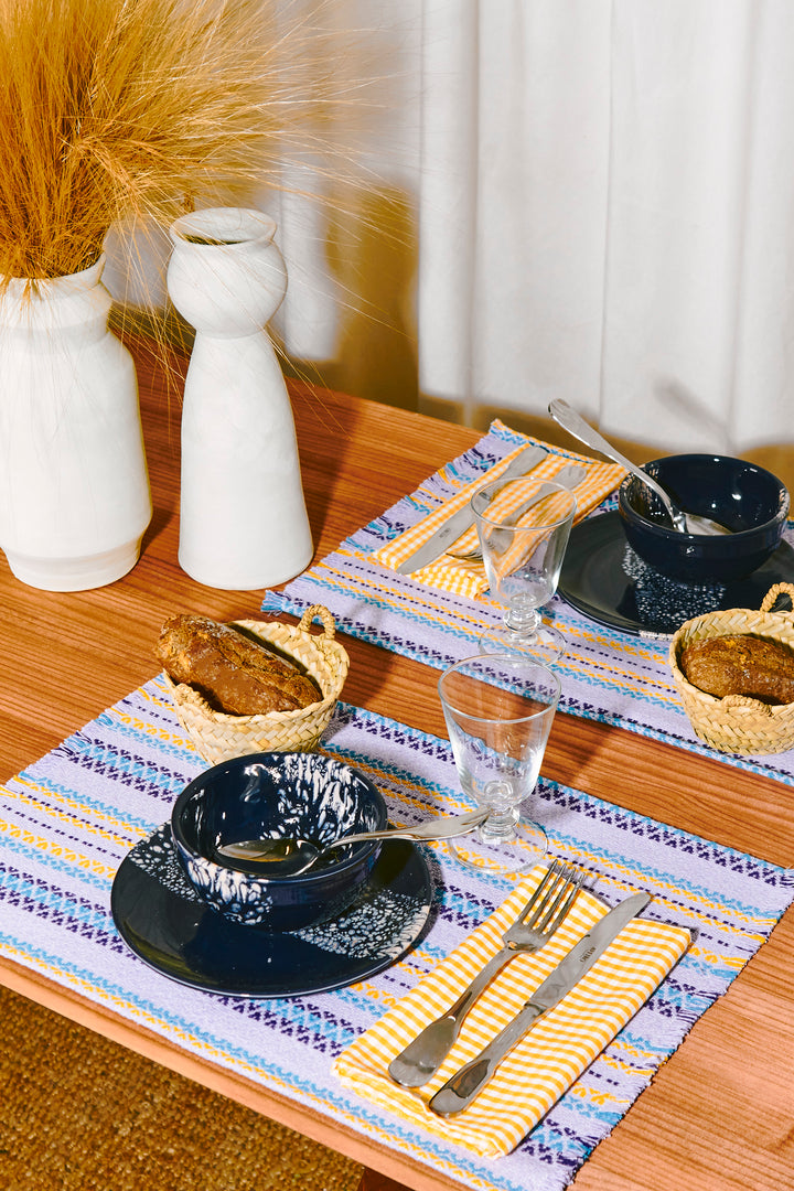 - Flecos de 1 cm del propio tejido, desflecados de forma artesanal.