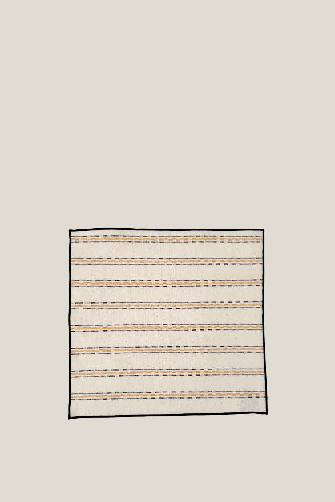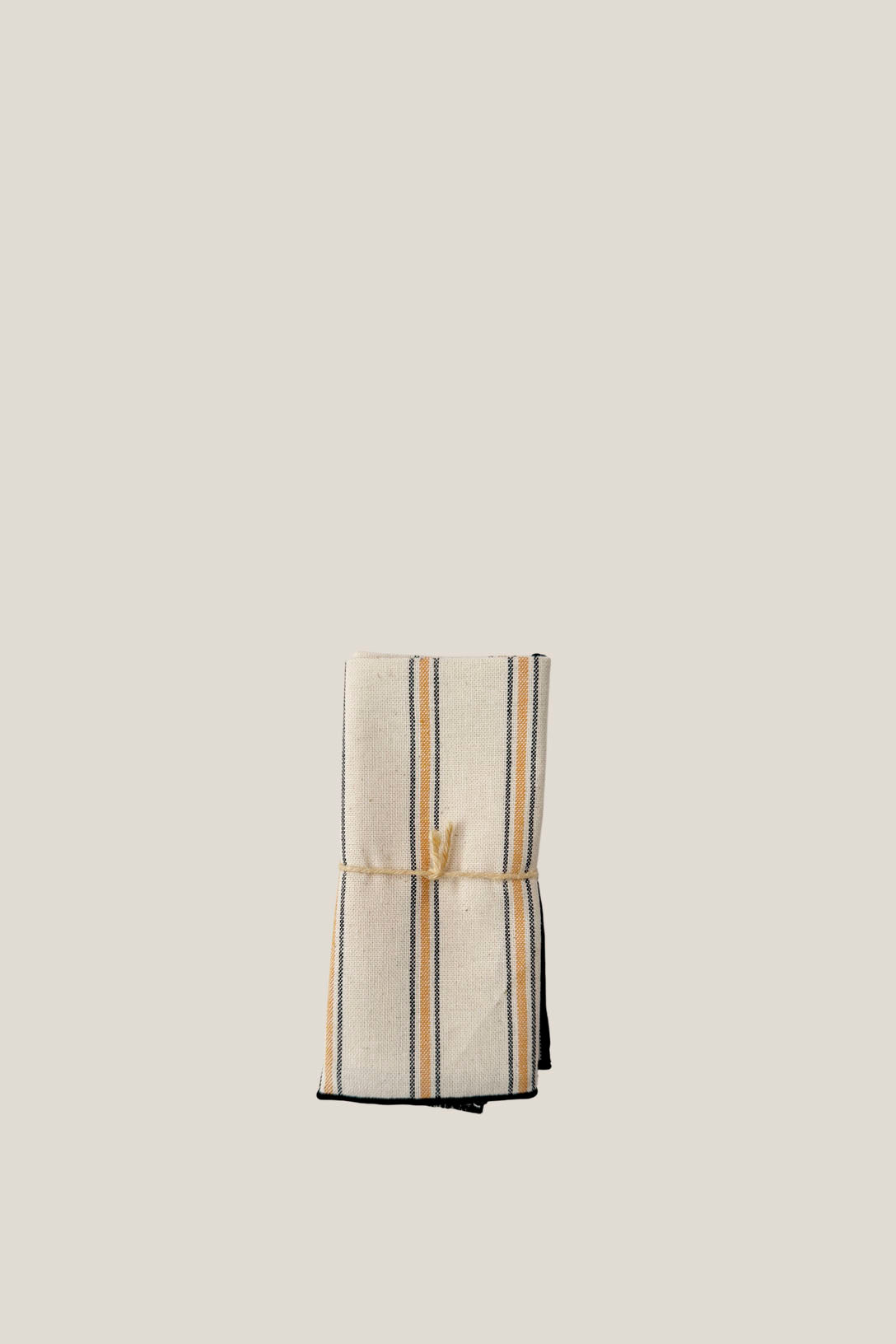 Dos servilletas con alma de merienda en el campo y de mesa de domingo. Hechas en nuestro tejido Dulcinea, con rayas suaves sobre fondo crudo y rematadas con un repulgo negro que les da el toque justo de contraste.