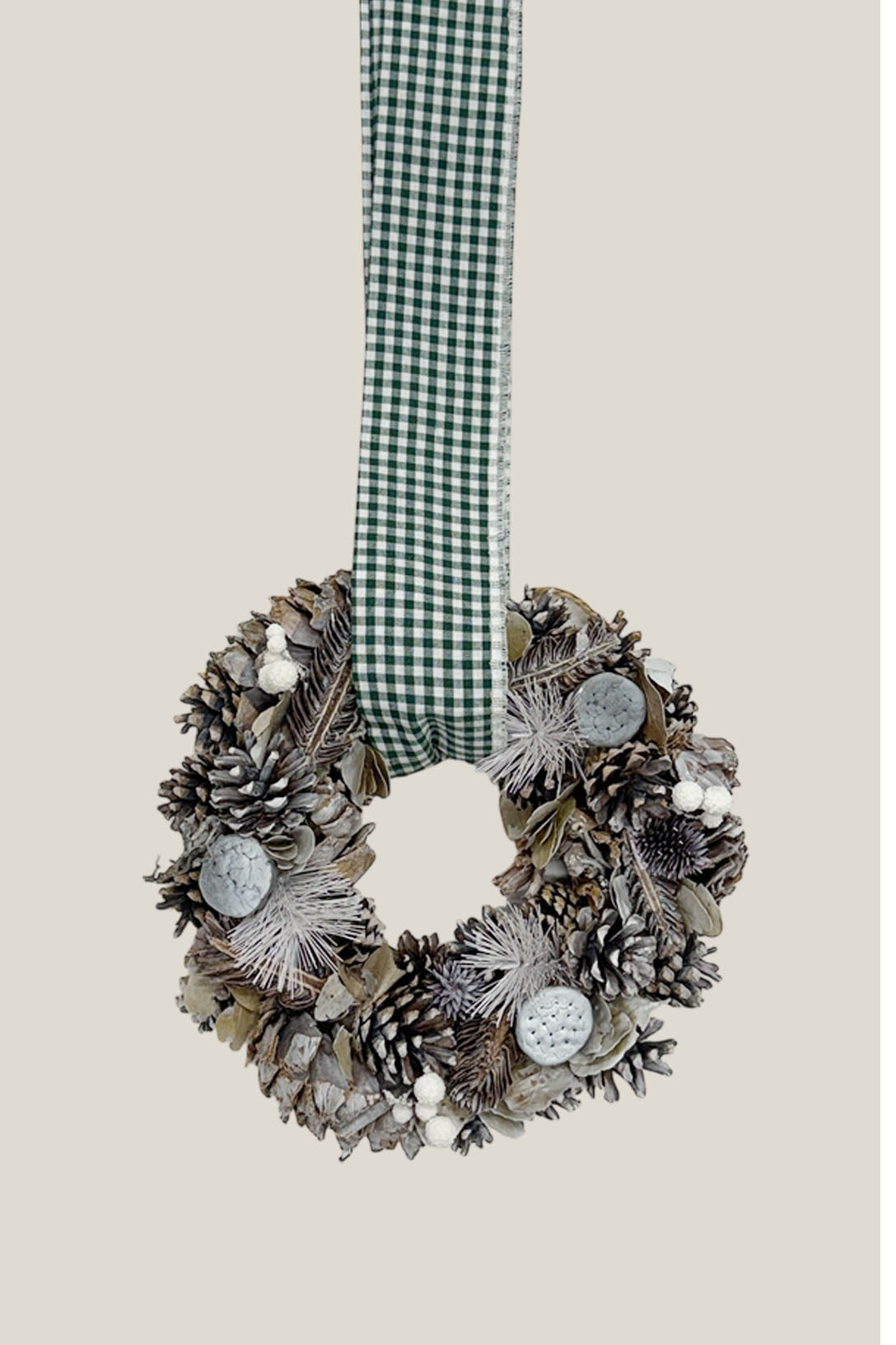 Incluye un lazo vichy que puedes elegir en el color que más te guste, perfecto para colgarla en la puerta, en el recibidor o en una pared especial. Ese detalle aporta el toque tradicional y acogedor que hace que esta corona encaje tan bien en hogares cálidos y con alma.
