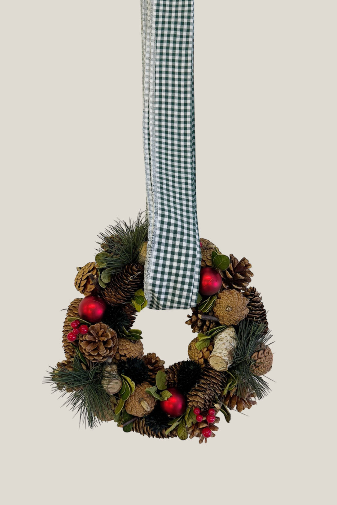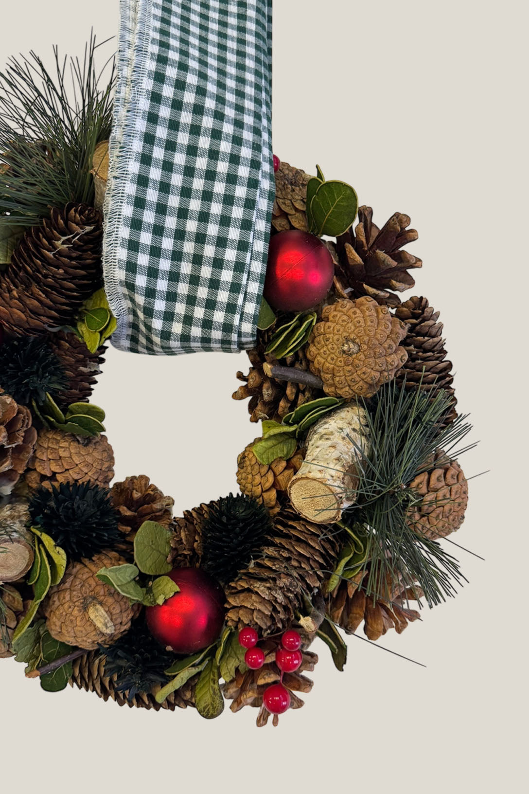 Esta corona de 30 cm es Navidad en estado puro: piñas, hojas, ramitas verdes y toques rojos brillantes que parecen sacados de una postal clásica. Es artificial, pero tan lograda que podría haber salido directamente de un paseo por el bosque un día frío de diciembre.