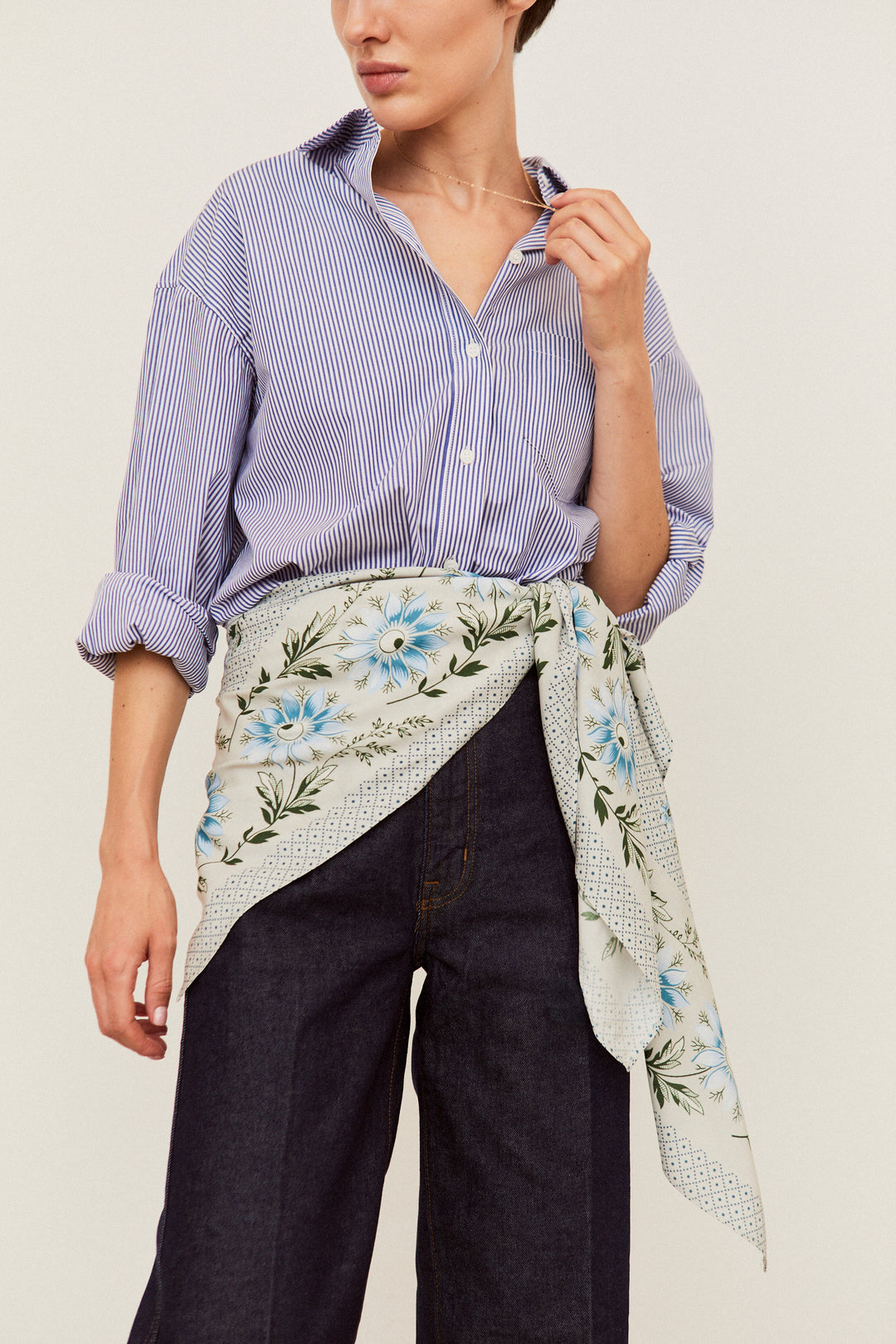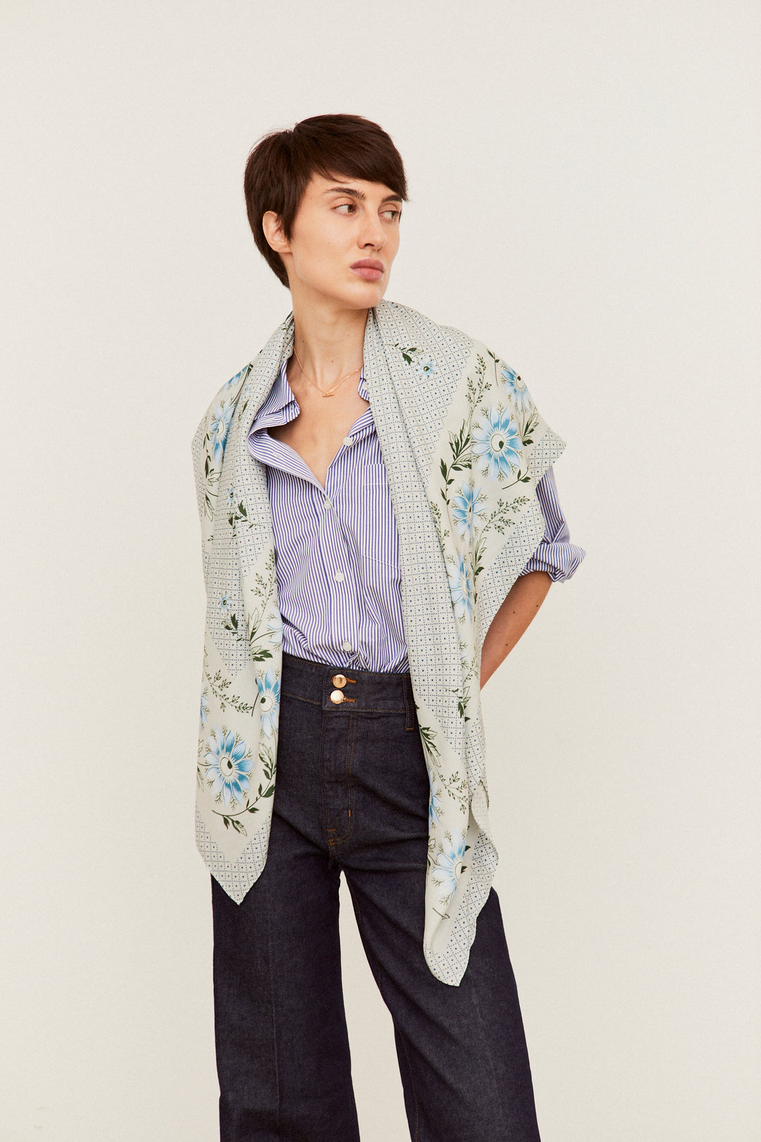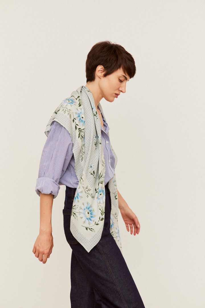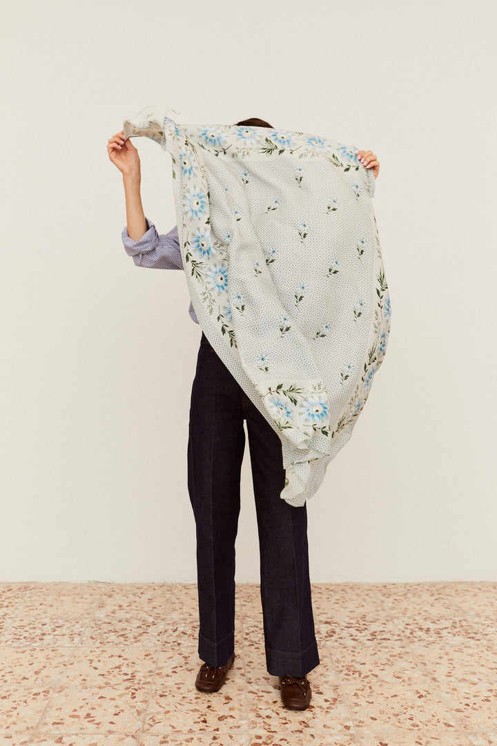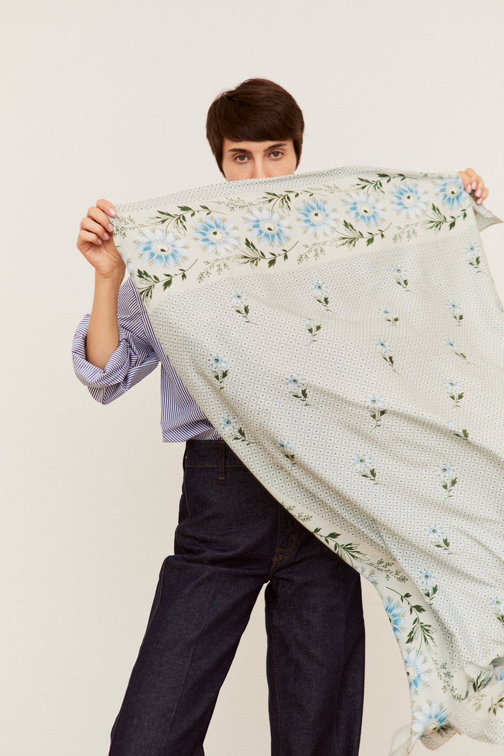 Nuestro pañuelo Indiana Jarilla en azul toma su nombre de una flor silvestre que crece libre por los caminos de nuestra tierra. Inspirado en los tradicionales pañuelos de indianas que llegaron a España en el siglo XVIII, este diseño recupera esa esencia popular y colorida, con un fondo vivo y un dibujo que combina tradición y frescura. Perfecto para llevar al cuello, en el pelo o como toque especial de cualquier look que quiera un poco de raíz y alegría.