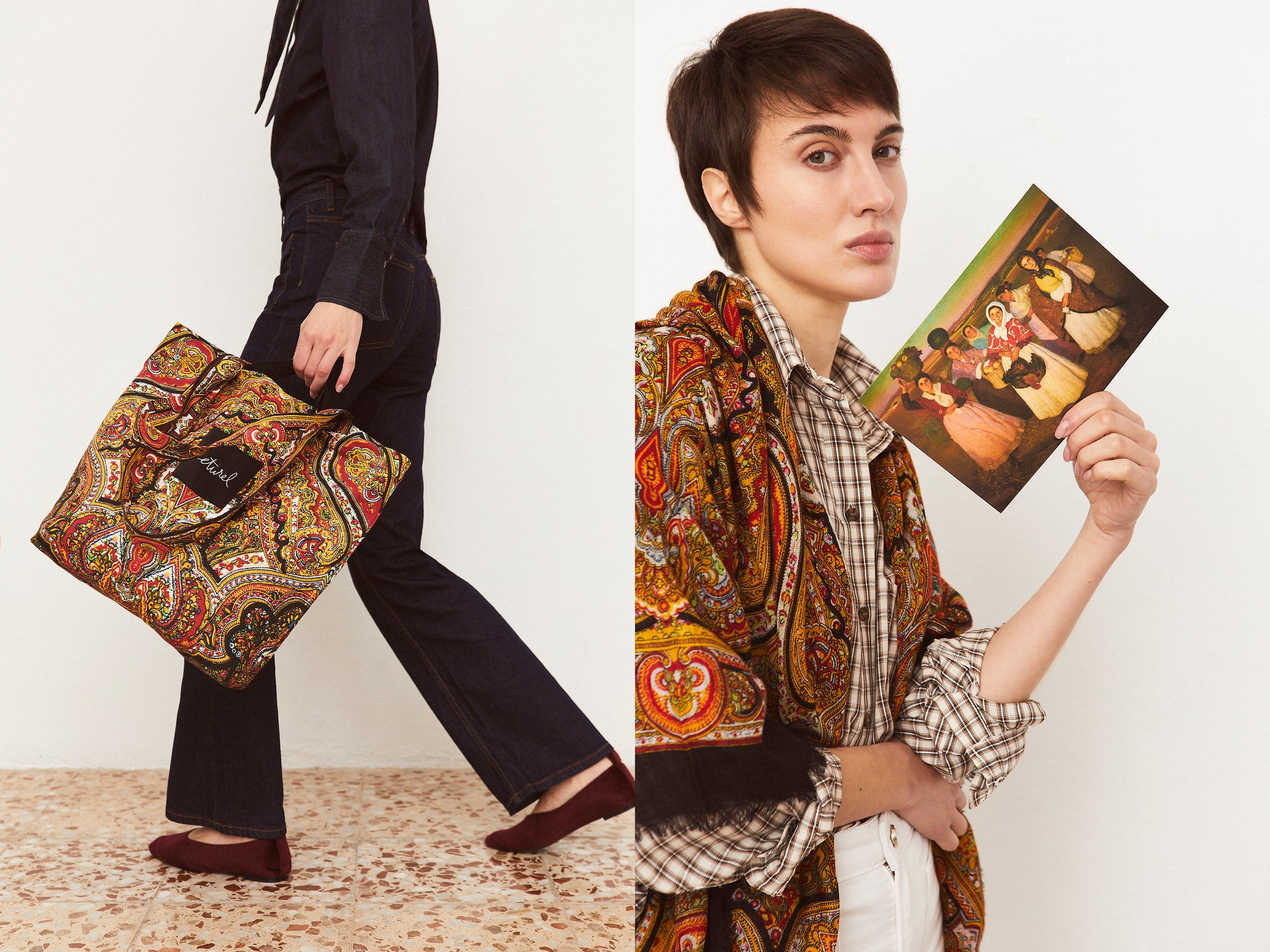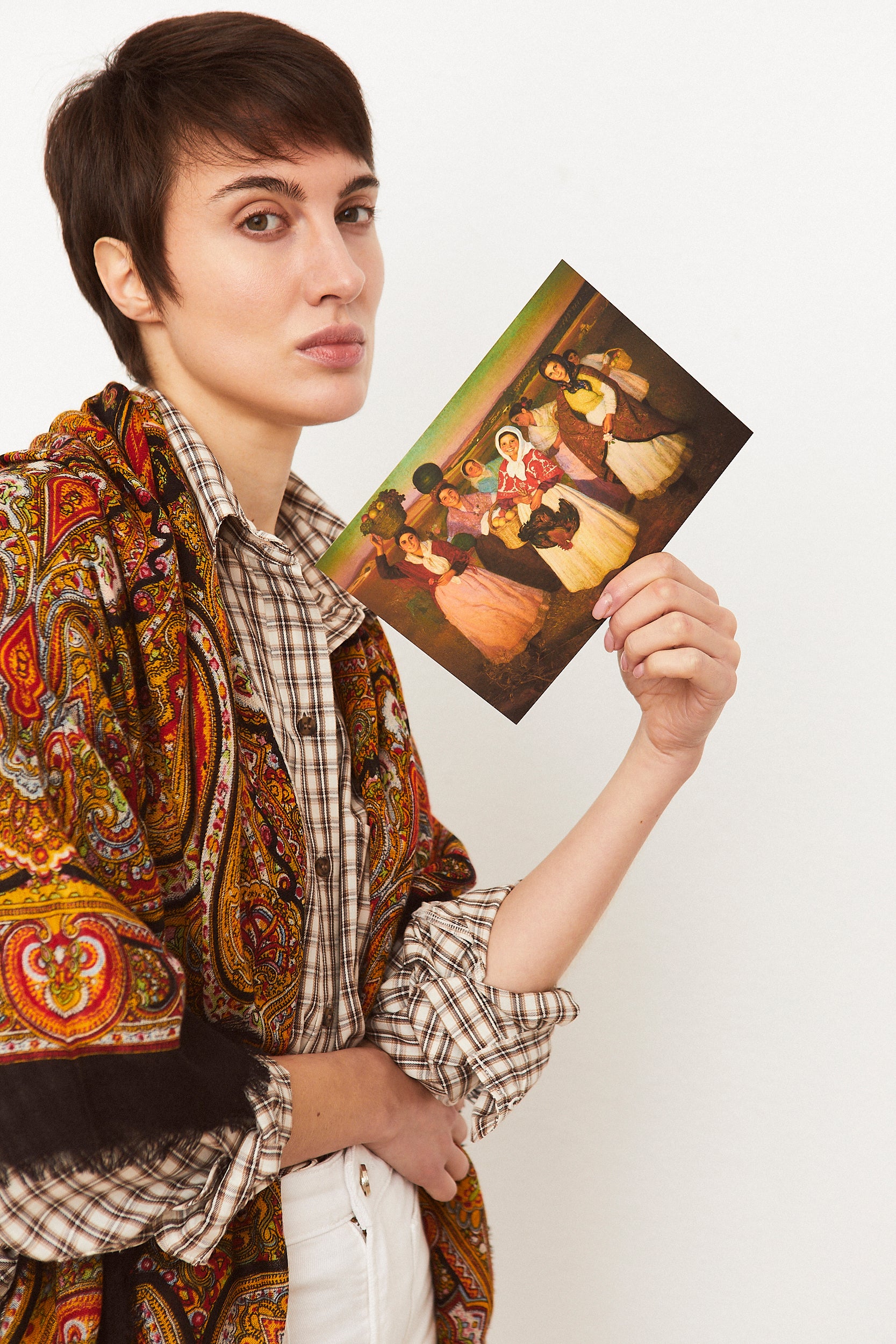 A la fiesta del pueblo (1917), de Eugenio Hermoso, celebra la vida y la tradición a través de mujeres del pueblo y sus pañuelos típicos. Esta obra ha inspirado nuestra colección Folklore, donde reinterpretamos esos colores y raíces para hoy.