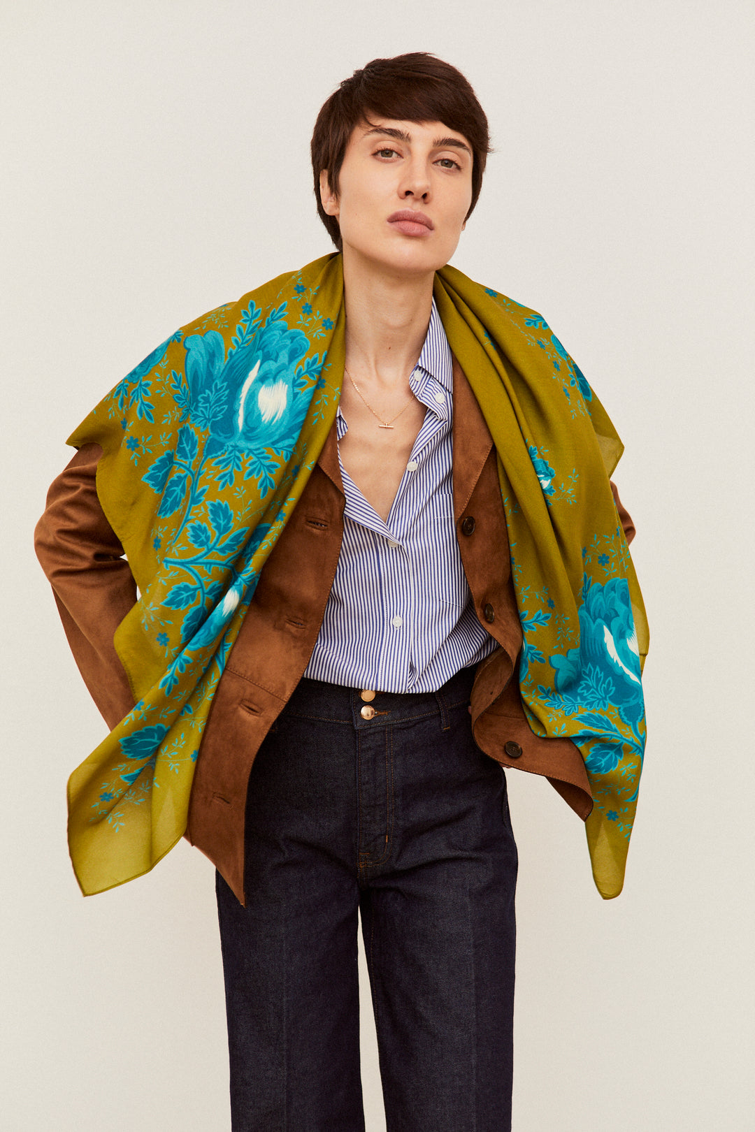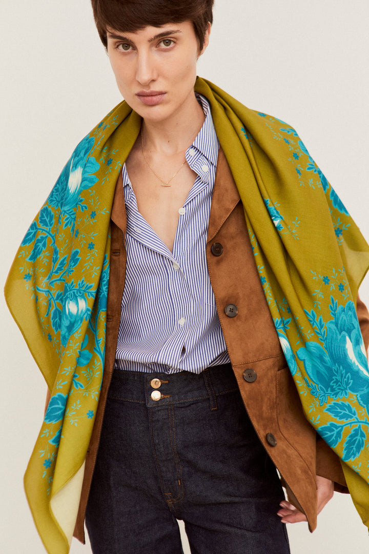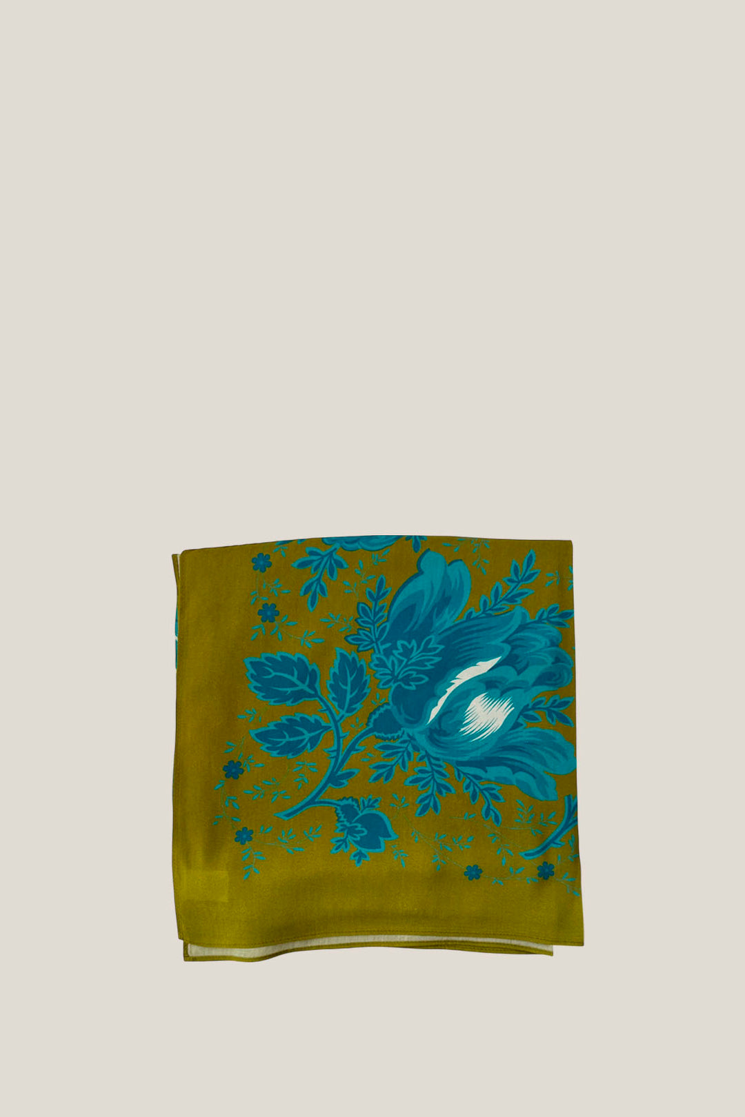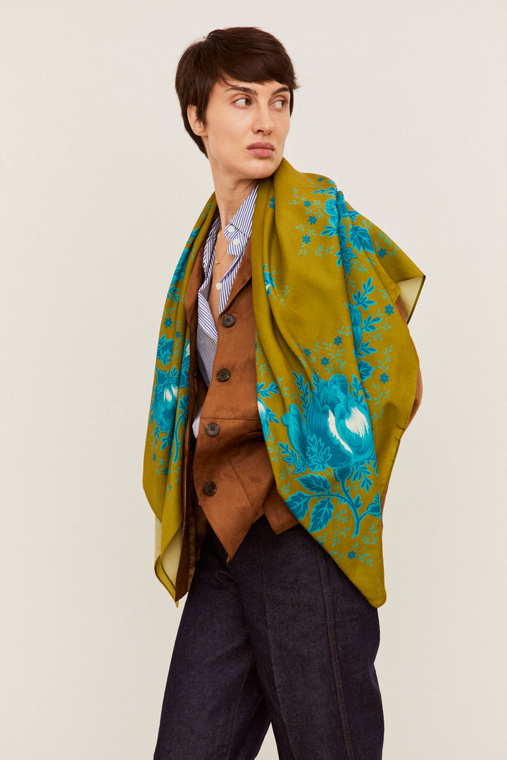 Con fondo verde oliva y flores en azul, este pañuelo se inspira en las indianas del siglo XVIII y en las mujeres gallardas: elegantes, decididas y con ese arte que no se aprende.