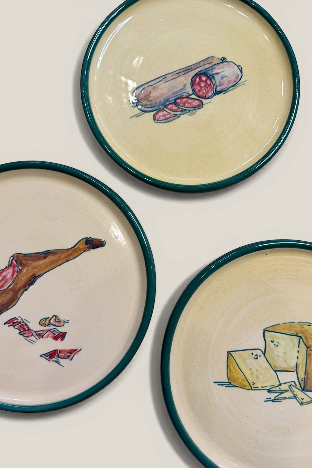Estos platos de aperitivo de cerámica pintada están pensados para presentar pequeños aperitivos, quesos, tapas o entrantes de forma sencilla y con mucho encanto. Elaborados en barro de color natural, destacan por su ribete verde y por el dibujo central pintado a mano, que aporta un toque artesanal y muy especial a cada pieza.
