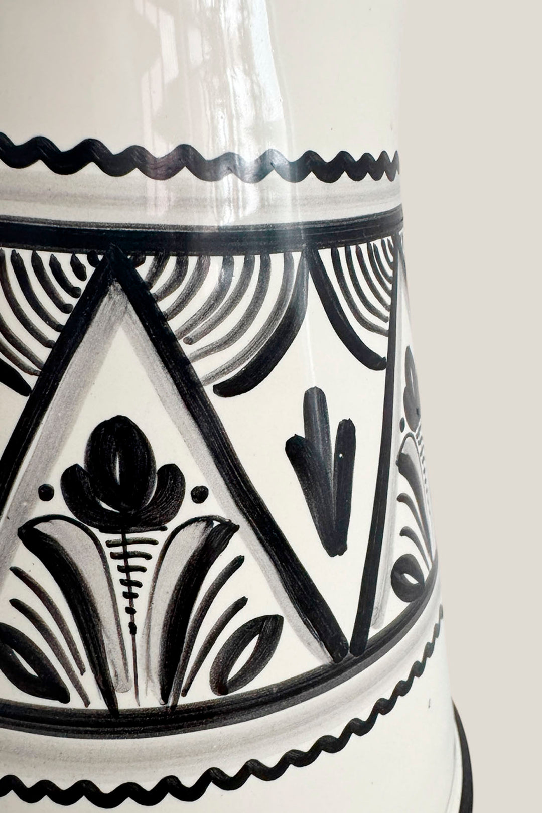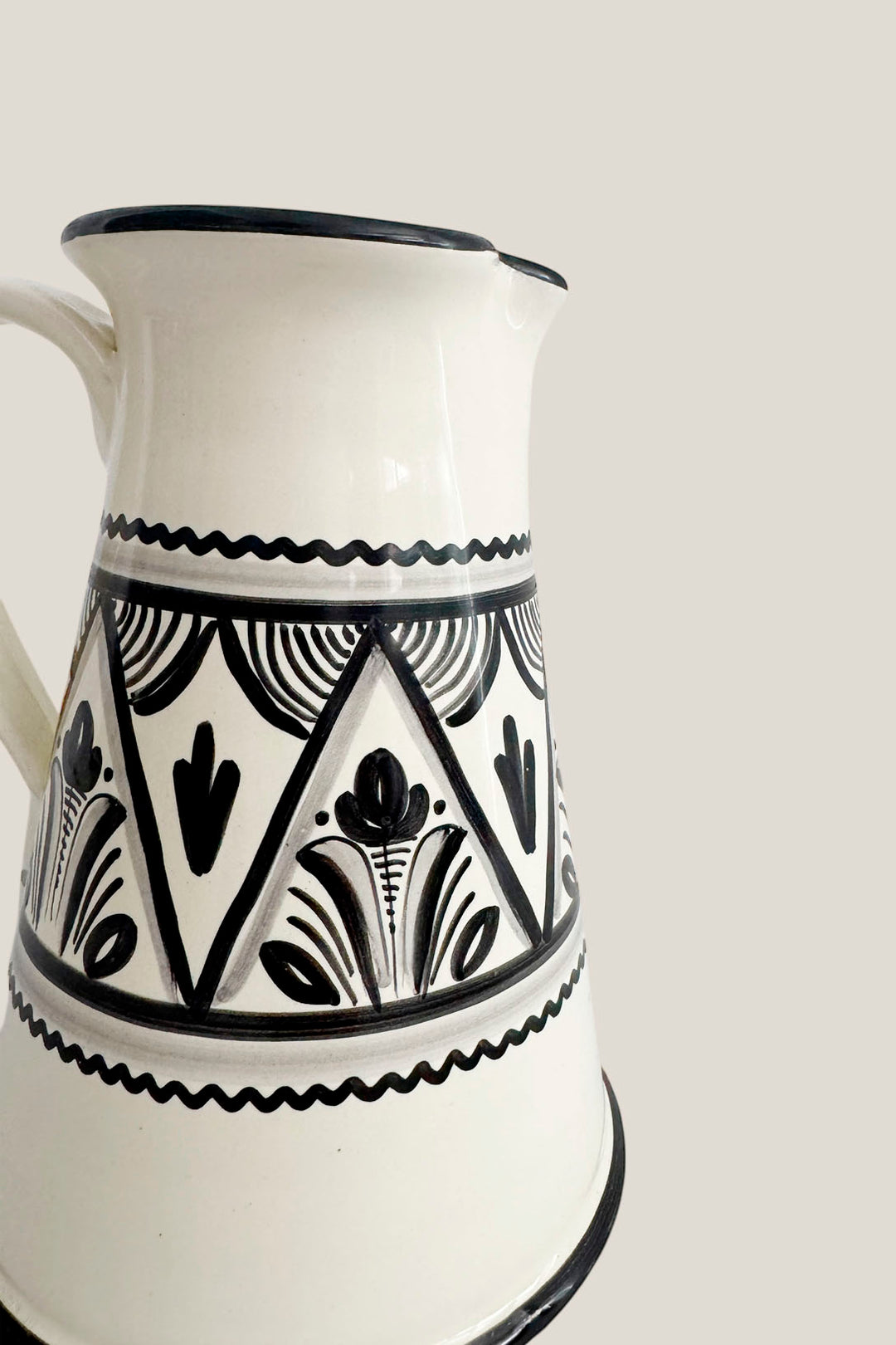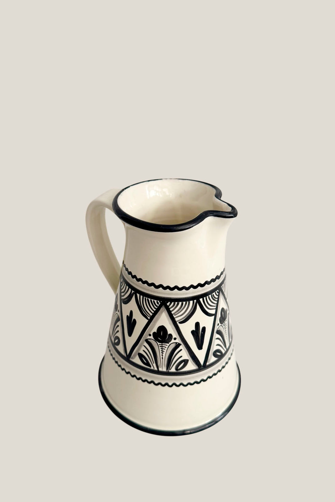 Su silueta robusta y su decoración clásica en negro sobre fondo crudo hacen que funcione igual de bien en una mesa llena de amigos que decorando una repisa. Sirve agua, vino, limonada… o simplemente deja que hable por sí sola.