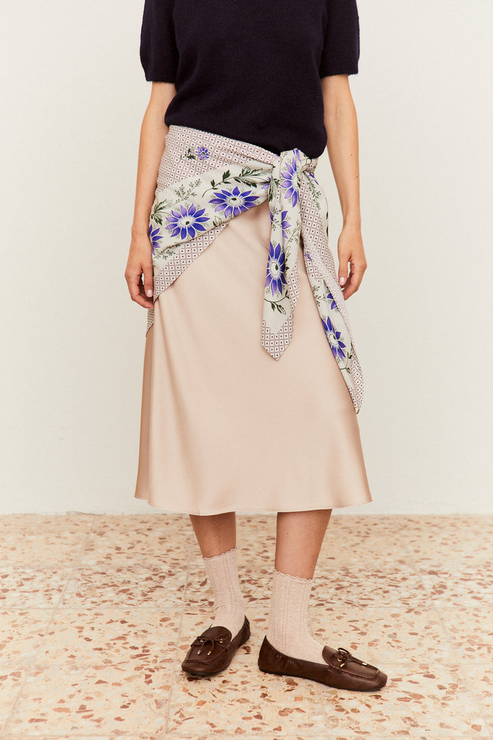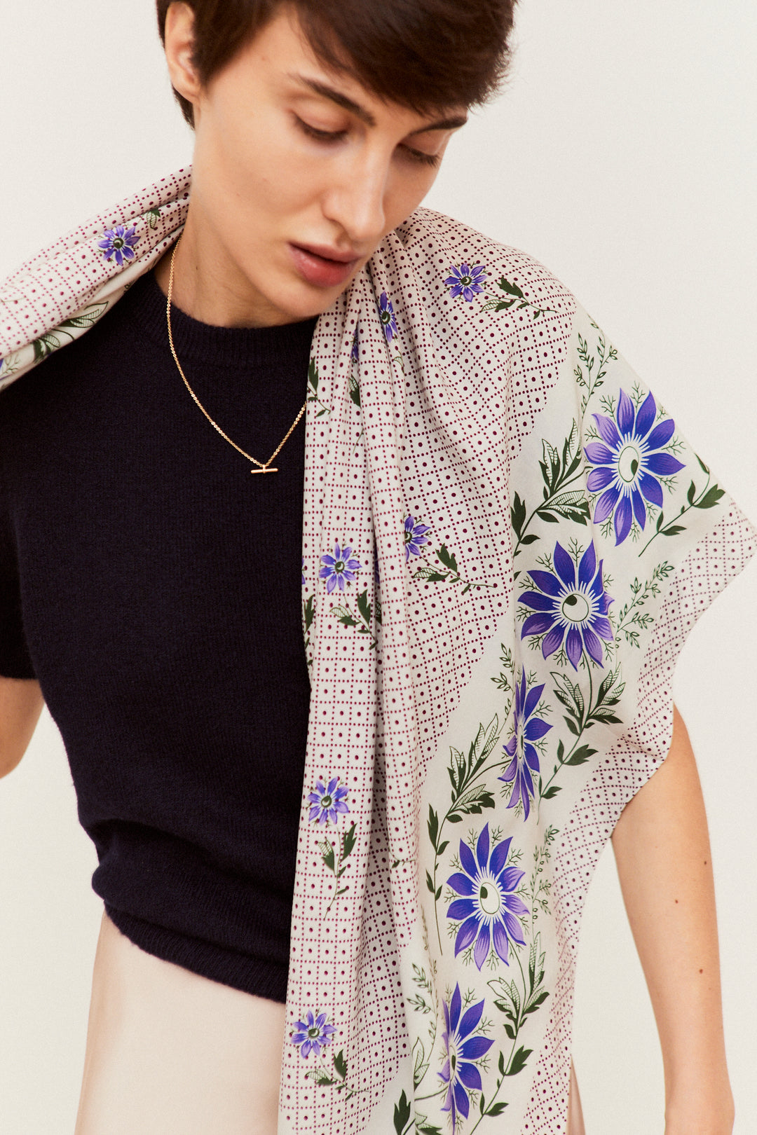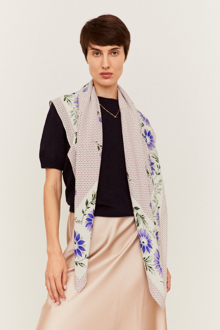 El pañuelo Indiana Jarilla en color malva es una oda delicada a los paisajes floridos del campo español. Inspirado en los tradicionales pañuelos de indiana que cruzaron medio mundo en el siglo XVIII para llenar de color nuestras fiestas y nuestros días, esta versión en malva recoge toda esa historia con un toque actual.
