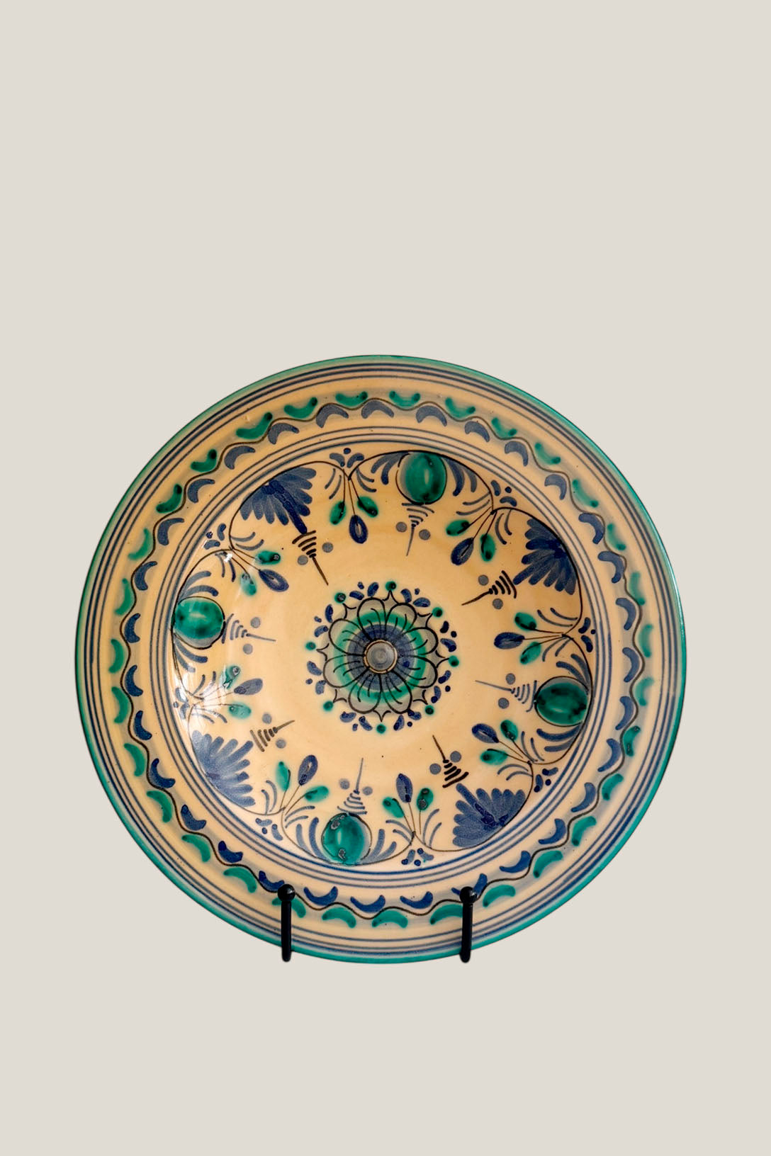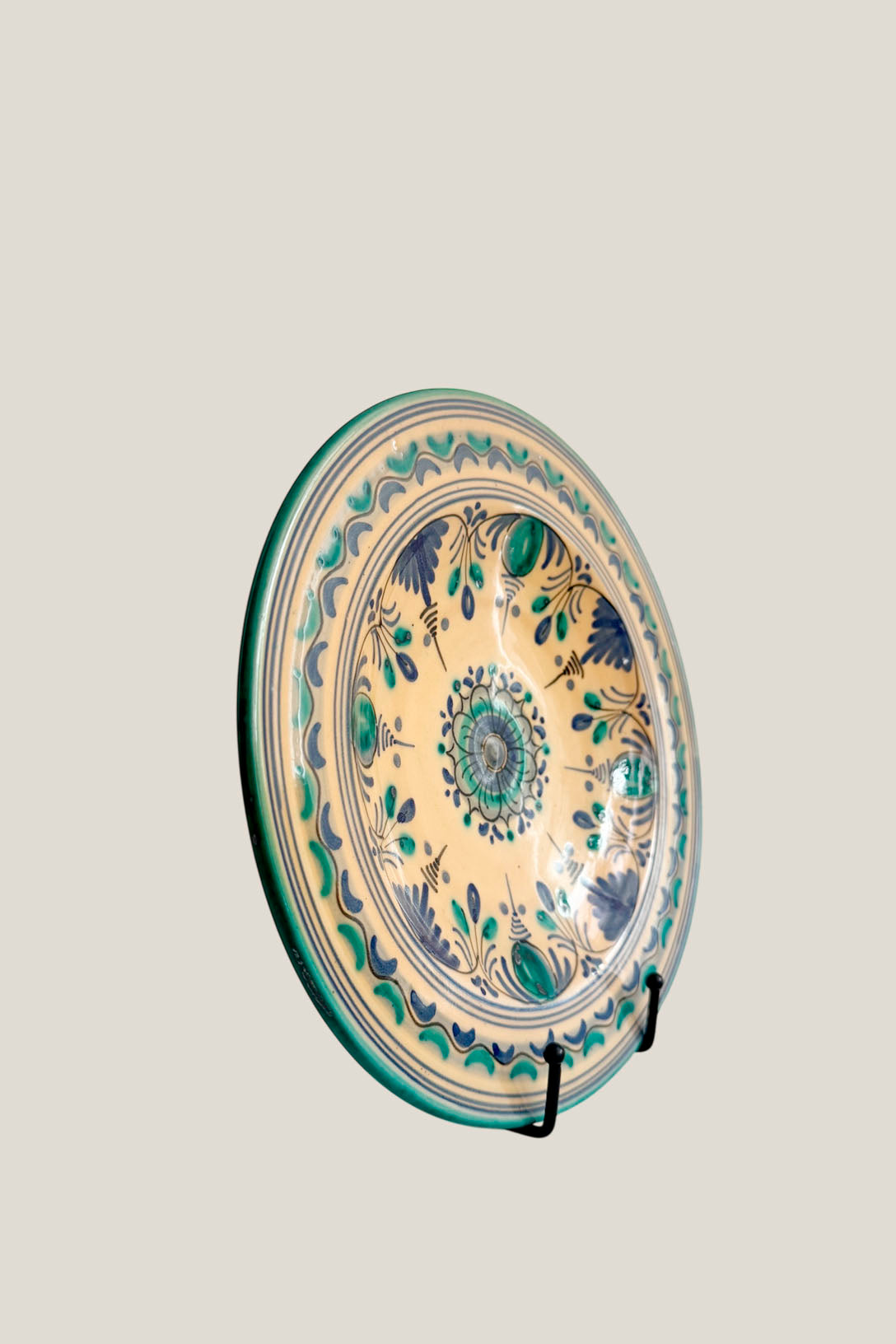 Este plato decorativo es una joya de la cerámica tradicional, hecha a mano en España y pintada con un detallismo que quita el hipo. Sus motivos florales en verdes y azules, sobre fondo natural, recuerdan a los antiguos platos colgados en las cocinas de campo, donde todo giraba en torno a la mesa. Ideal para colgar en la pared, para usar en una mesa especial o para regalar algo con alma y raíces. Porque lo bonito, si es artesanal, siempre cuenta una historia.